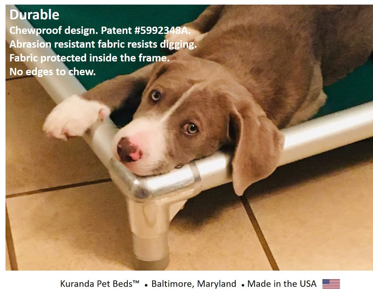 The original chewproof dog bed and still the best. Kuranda patented the Chewproof Dog bed in 1998 and we have improved our beds every year since then. Wide rails prevent chewing by larger breeds. Heavy duty fabric resists digging and supports up to 250