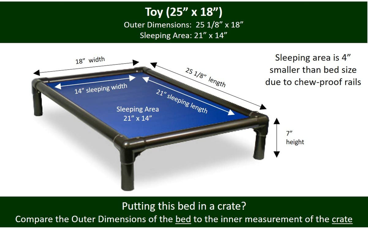 The original chewproof dog bed and still the best. Kuranda patented the Chewproof Dog bed in 1995 and we have improved our beds every year since then. Wide rails prevent chewing by larger breeds. Heavy duty fabric resists digging and supports up to 250
