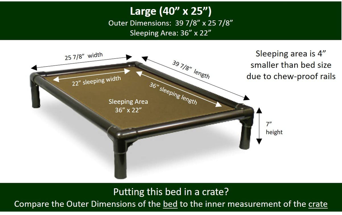 The original chewproof dog bed and still the best. Kuranda patented the Chewproof Dog bed in 1995 and we have improved our beds every year since then. Wide rails prevent chewing by larger breeds. Heavy duty fabric resists digging and supports up to 250