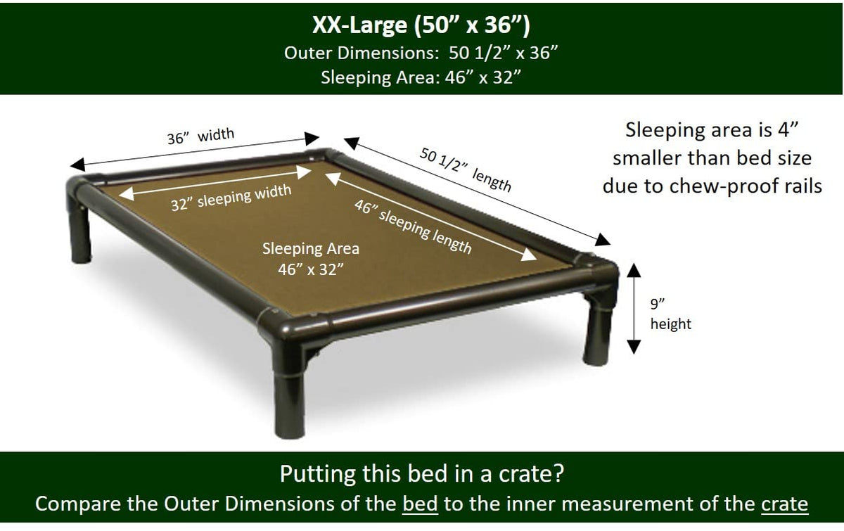 The original chewproof dog bed and still the best. Kuranda patented the Chewproof Dog bed in 1995 and we have improved our beds every year since then. Wide rails prevent chewing by larger breeds. Heavy duty fabric resists digging and supports up to 250