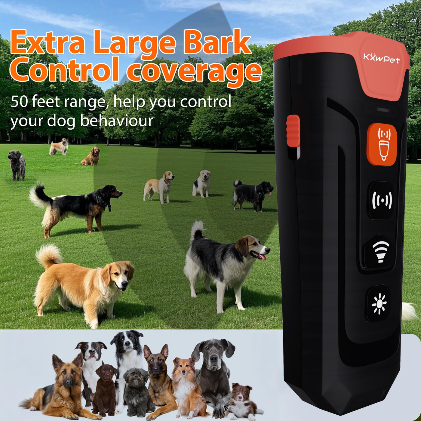 Kxwpet Ultrasonic Dog Bark Deterrent Device, 50 Ft Range, Led Flashlight, 3 Heads, Correct Dogs Bad Behaviors Without Harm, Alte