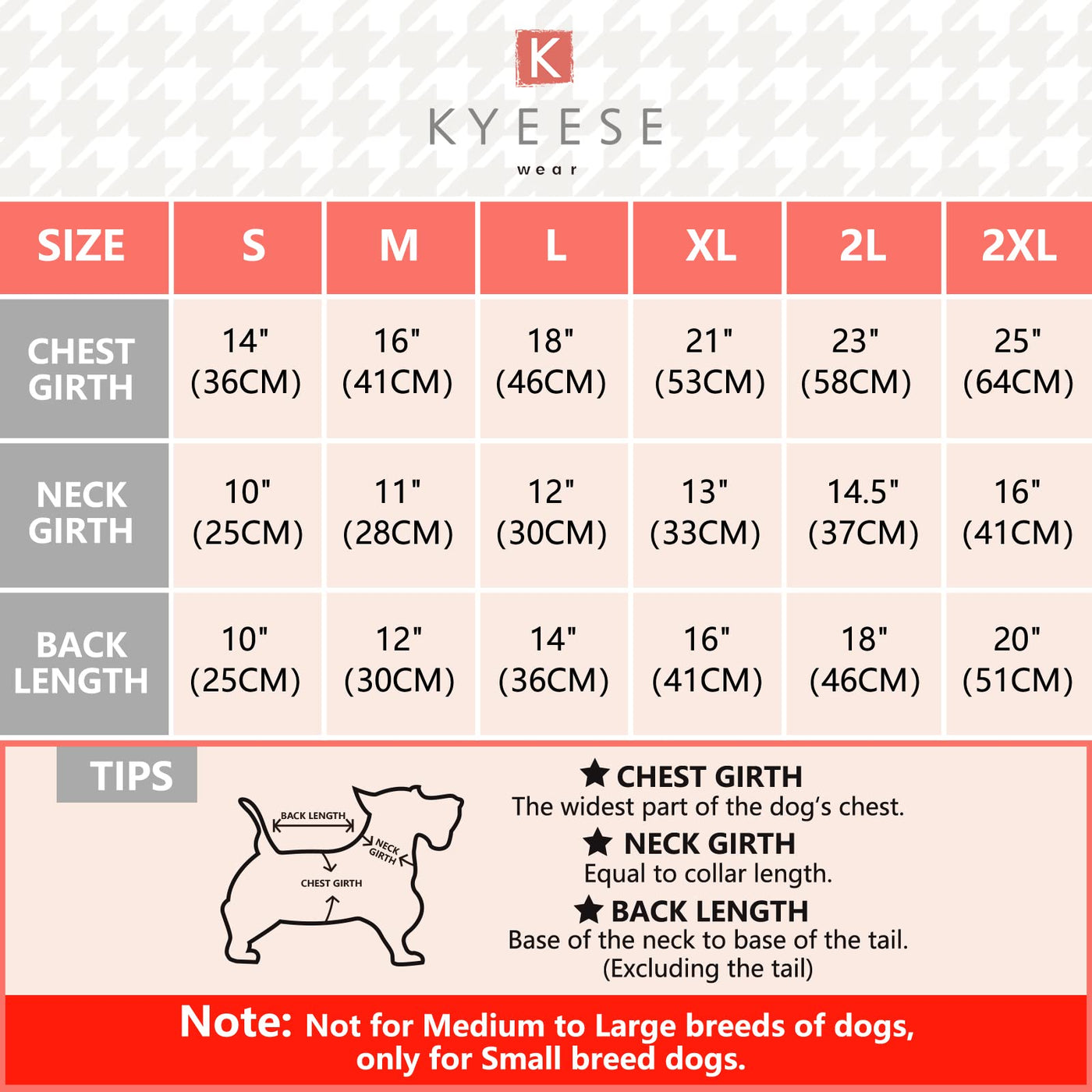 Q: What sizes are available for the KYEESE Dog Shirts?A: The KYEESE Dog Shirts are designed for small dogs or cats. It is important to measure your pet's chest girth and back length before ordering. If your pet is between sizes, please size up to ensure a comfortable fit.