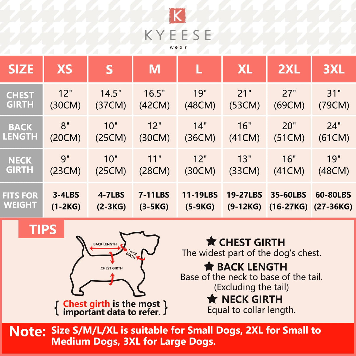 ?About Size?Please don 't choose the size based on your usual size measure your pet 's chest girth in priority and back length get the right size based on KYEESE size chart. If your pet is still growing or your pet has a stout body please do size up.