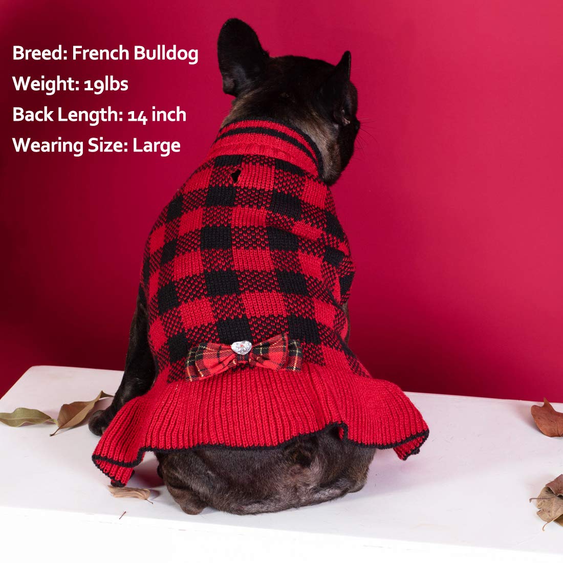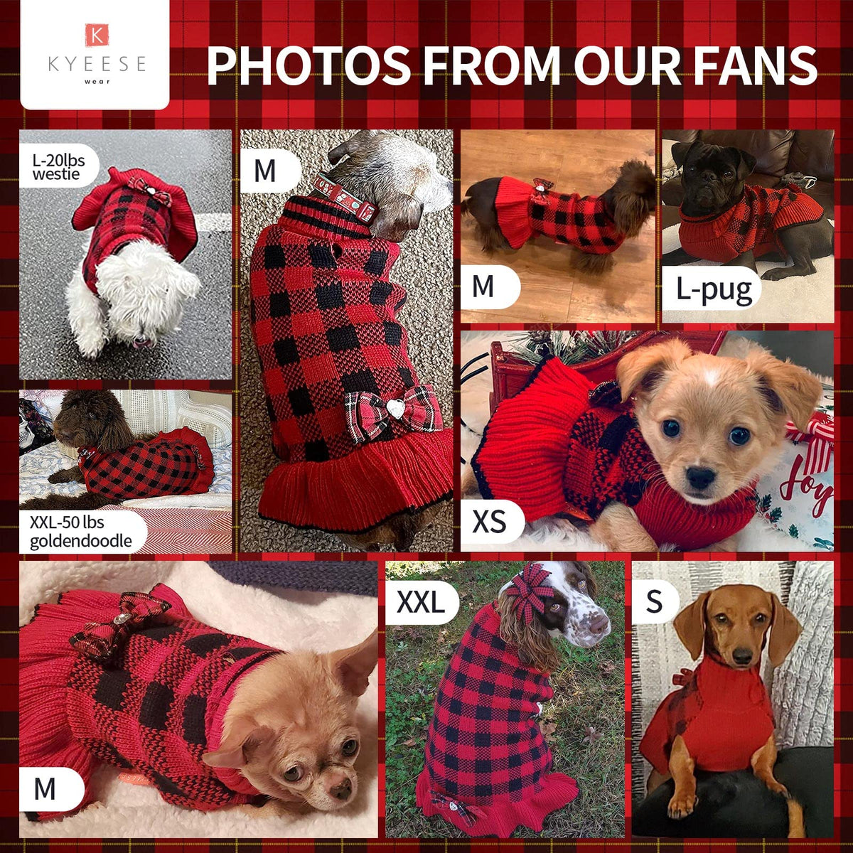Q: What is the design of the KYEESE Christmas Dog Sweater?A: The sweater features a festive red checkered pattern, complete with a cute bowtie and ruffle dress, making it a fashionable choice for your pet during the holiday season.
