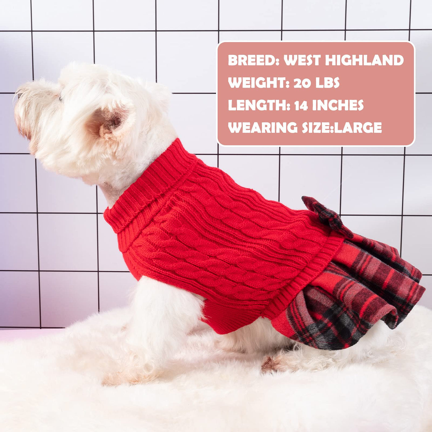 Q: Does the sweater have any special design features?A: Yes, this dog sweater dress features a trendy gingham patchwork design and includes a cute bowtie, making it a fashionable addition to your pet's wardrobe.