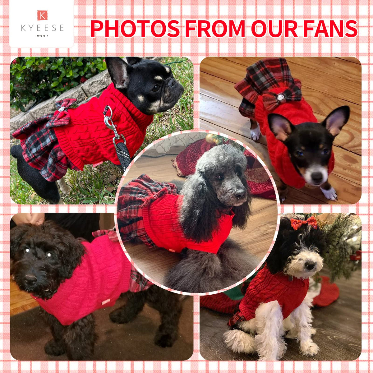 Q: What material is the dog sweater made of?A: The KYEESE Christmas Dogs Sweater Dress is made of acrylic, which makes it very stretchable, soft, and comfortable for your pet to wear.
