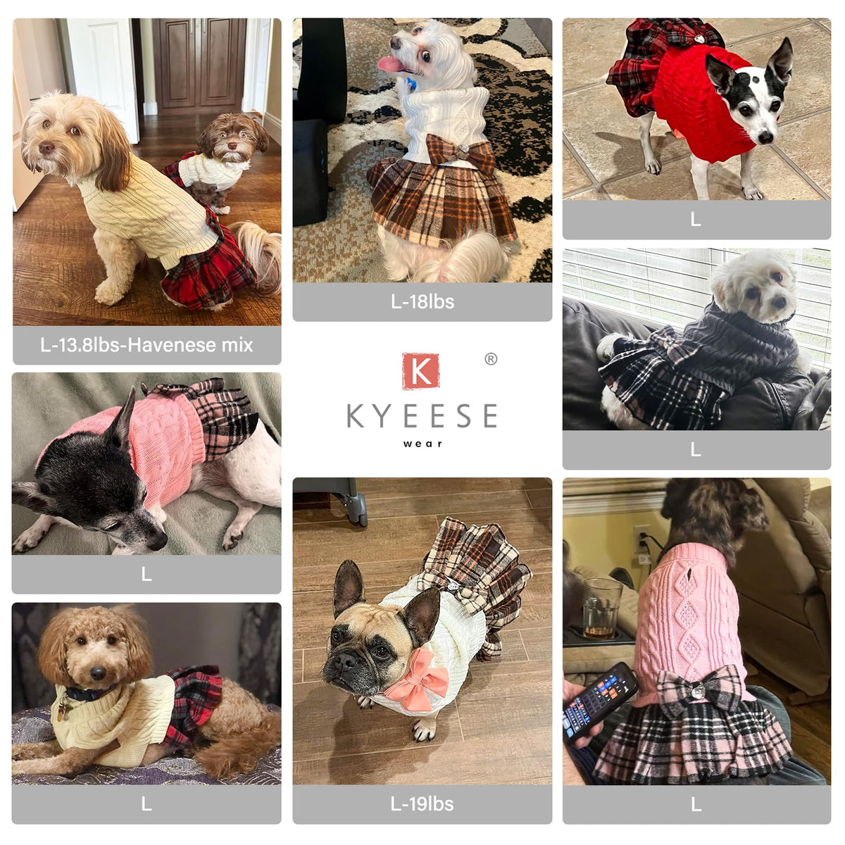 Q: What sizes does the KYEESE Dog Sweater Dress come in?A: The KYEESE Dog Sweater Dress is available in size Large, which is specifically designed to fit small dog breeds such as Shih-Tzu, Dachshund, Pug, and Mini Schnauzer. It is important to measure your pet before purchasing to ensure the right fit.