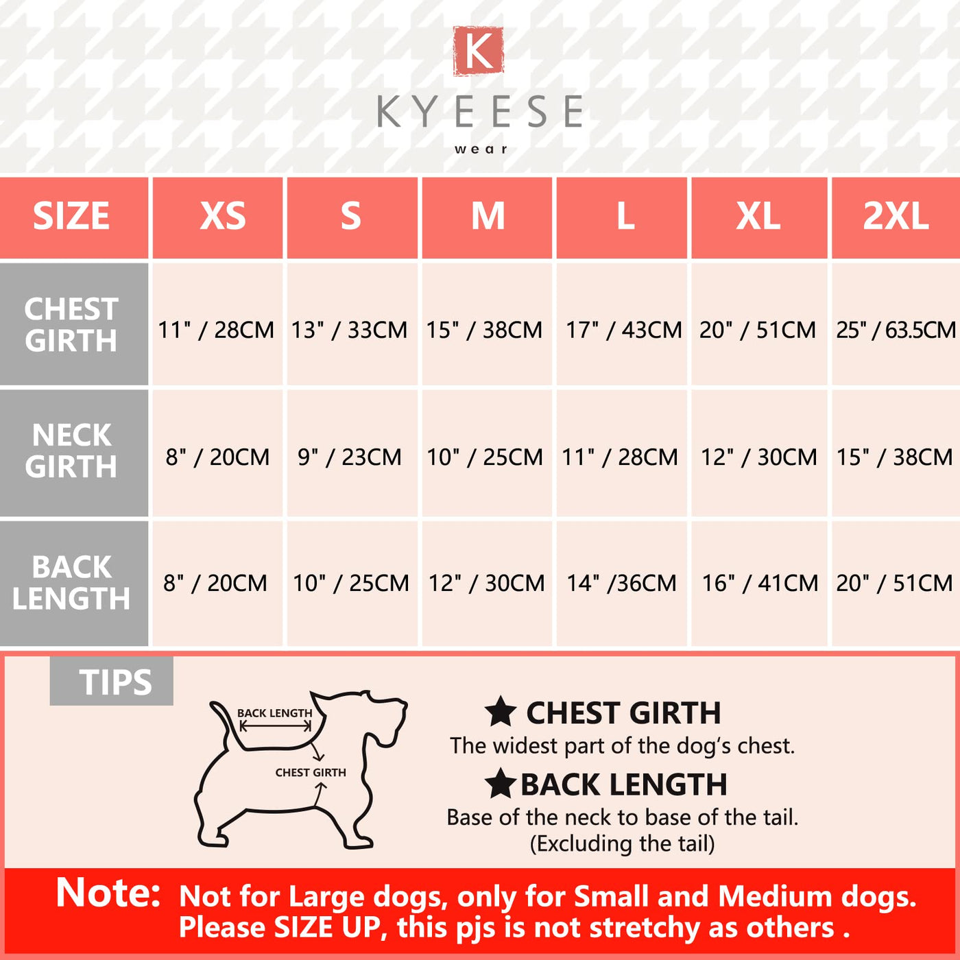 Q: What sizes are available for the KYEESE Dogs Pjs?A: The KYEESE Dogs Pjs are designed to fit small to medium dogs, with specific measurements for the XX-Large size, including a chest girth of 25 inches, neck girth of 15 inches, and back length of 20 inches. It's essential to measure your pet before ordering to ensure the best fit.