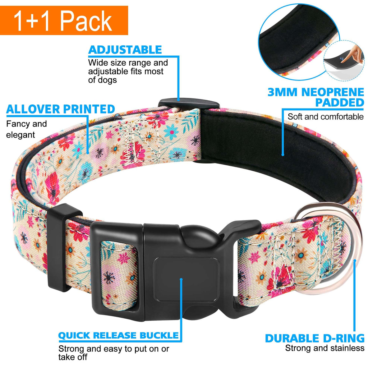 Ladoogo Reflective Dog Collar Padded With Soft Neoprene Breathable Adjustable Nylon Dog Collars For Small Medium Large Dogs (Medium (Pack Of 1), Vanila/Pink Floral Collar+Leash)