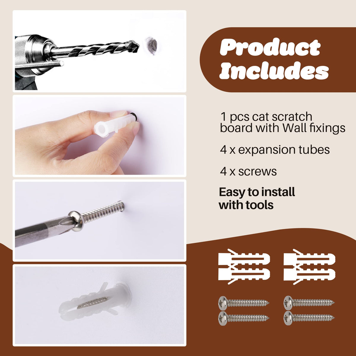 Q: How do I install the cat scratching pad on the wall?A: The scratching pad comes with wall fixings and screws, allowing for easy installation on walls or corners. Simply use the provided expansion tubes and screws to secure the scratcher to your desired location.