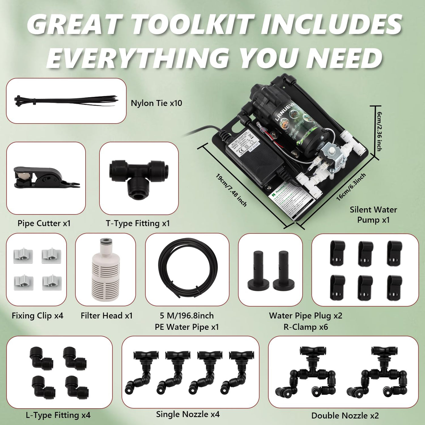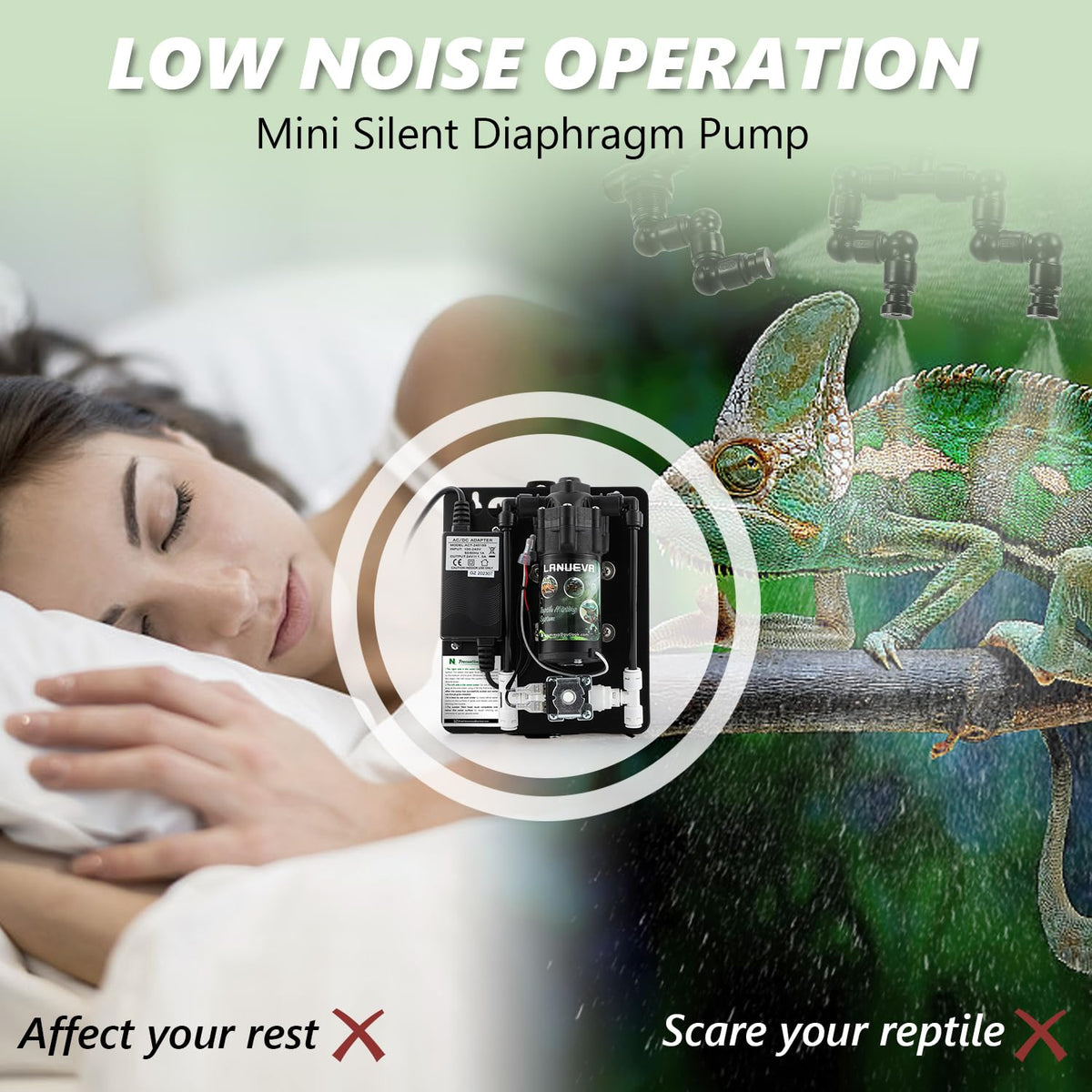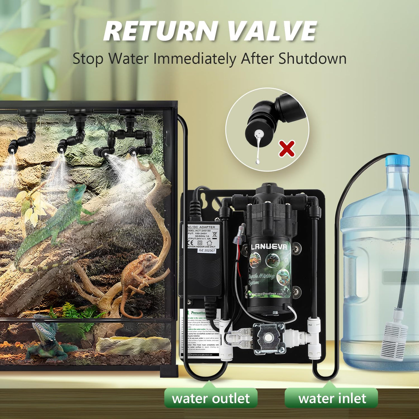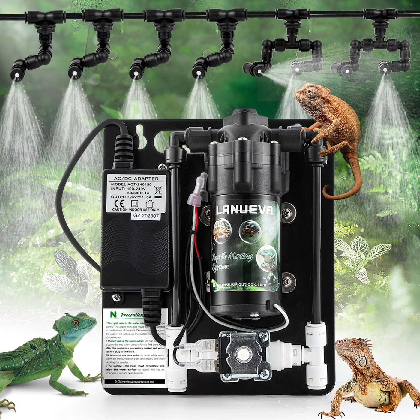 Brand: LANUEVA Professional Online Guidance (reply within 24-hour) Product Name:Reptile Humidifier Application: For Reptiles, Chameleon, Lizard, Snake, Frog Specification Weight:2kg Power:40w Voltage: 100-240v Working Pressure:4-8 bar Package List Silent Water Pump x1 Single Nozzle x4 Double Nozzle x2 Filter Head x1 Nylon Tie x10 5 Meter Water Pipe x1 Fixing Clip x4 Pipe Cutter x1 T-Type Fitting x1 L-Type Fitting x4 Water Pipe Plug x2 R-Clamp x6 User Manual x1