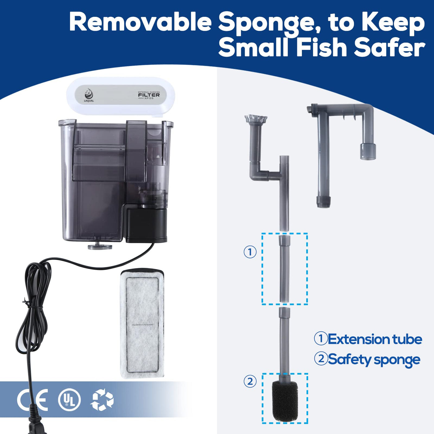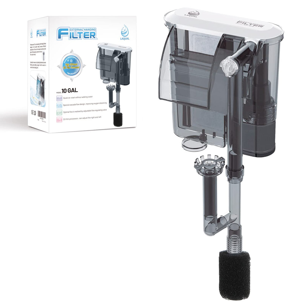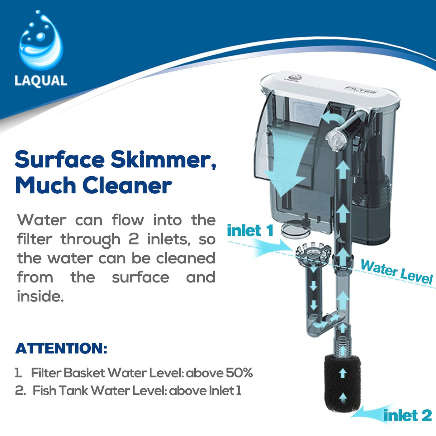?How to Use Laqual Filter?The filter is suitable for 5-12 gallon fish tank. 1. Before each restart make sure the filter basket water level is above 50%. Before the first use we recommend filling the filter basket with water. 2. Fish tank water level must be above the water inlet of the surface skimmer. 3. The maximum water intake is 47.6gal (160L) / h. Two 2.4in (6cm) extension tubes can be adapted to different water levels. Please feel free to message us if there is any problem during use.