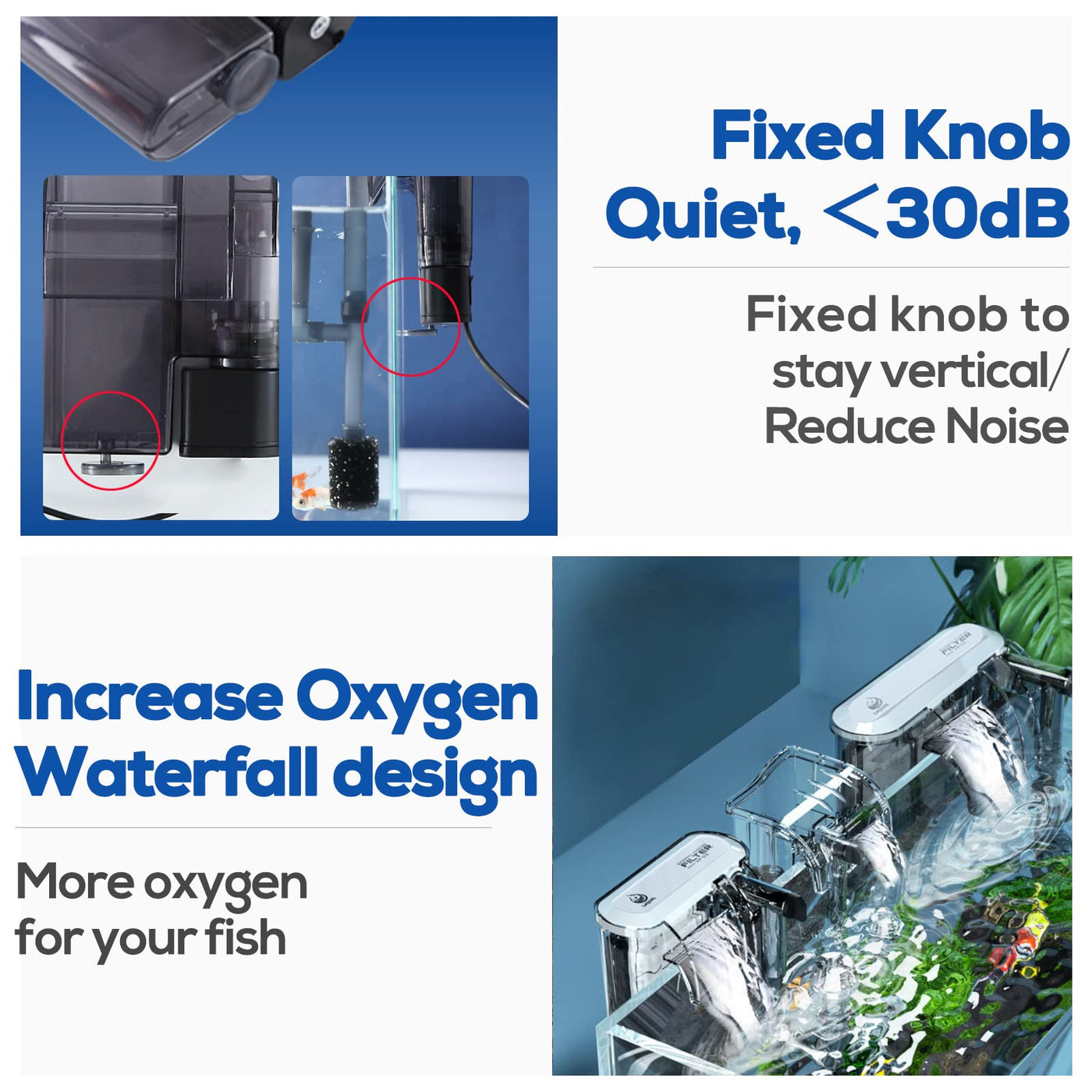 ?Waterfall Design Adjustable Flow & Increase Oxygen?Different kinds of fish need different intensities of water flow. Just toggle the adjustment switch to easily choose the right water flow. The small waterfall also produces more oxygen. It saves you the money for another oxygen bar. It 's no longer a dream to build a little sea world in your own house.