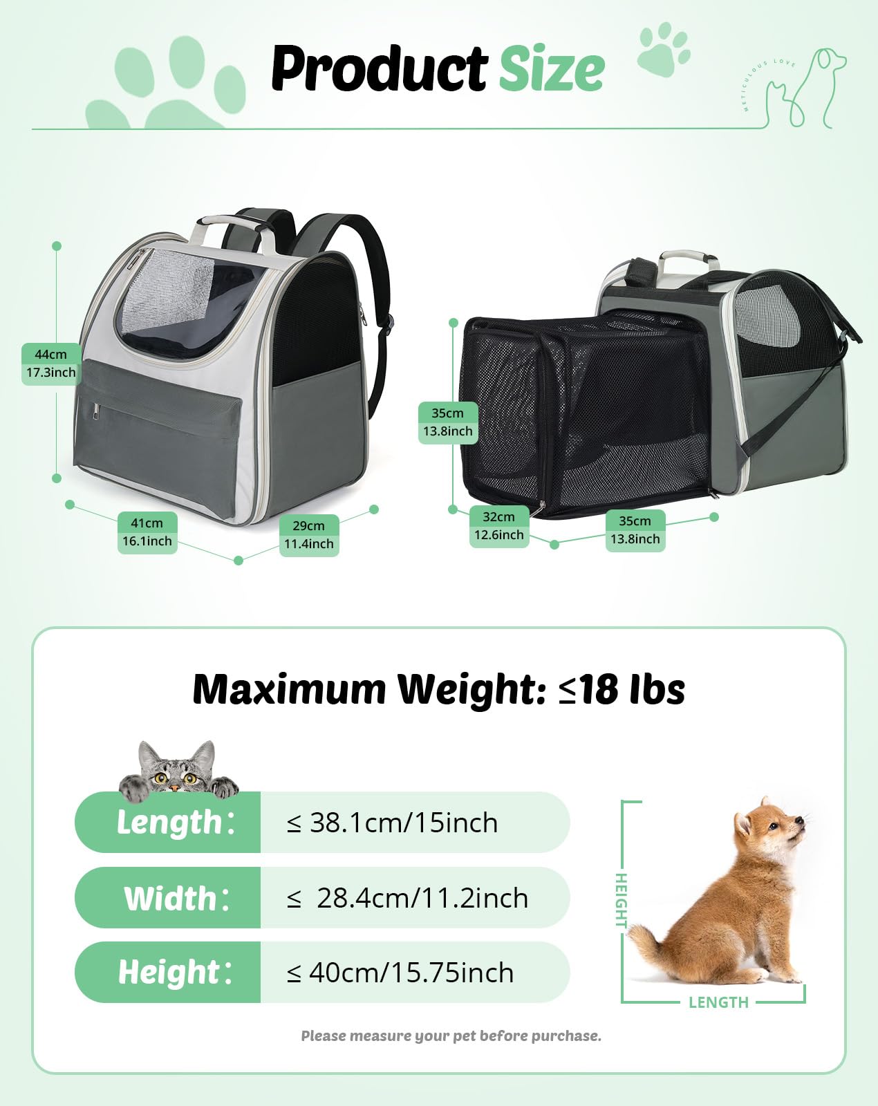 Specification: Product Name:Petcozife Cat Backpack Carrier, Pet Carrier Expandable For Large Small Cats Or Dogs Up To 18Lbs With Breathable Mesh, Dog Travel Back Pack Airline Approved For Running Hiking Camping Outdoor Color: Grayish White Expanded Size:18.5''L*30.31''W*11.41''H Unexpanded Size:16.14''L X 25.19''W X 15.75''H Item Weight:3.1Lb Material: Oxford Cloth Function:Bringing Small Pets Such As Dogs And Cats Features:Expandable,With Storage Pockets, Anti-Escape Cord, Interactive Window, Carry On The Shoulder, Handheld Package Includes: 1 X Manual 1 Xpet Carrier Backpack