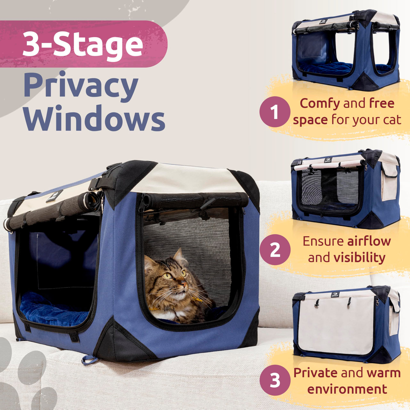 PetLuvs premium soft-sided pet carriers are the treat that lasts a lifetime! Say goodbye to cramming your kitty into a cold and unwelcoming mailbox-sized carrier or luring your precious pooch to yet another vet visit. With PetLuv, we make pet travel a pleasure-for you and your pet! Weve spared no luxury in our soft-sided carriers that have 4x the space compared to traditional pet carriers. Our exclusive design features four access panels that let your pet experience the world around them safely. For nervous pets or those that just need some me time, solid privacy panels block out sights and distractions so they can enjoy some R&R. A removable pillow is ultra plushy and will become your pets new favorite hangout. This double sided pillow is durable and machine washable (not just the cover) to make cleanup a breeze. We use a powerful combination of heavy-duty nylon, canvas, and mesh supported by a lightweight yet sturdy collapsible metal frame. The carrier folds flat for easy storage and wipes clean to stay looking and working like new. Weve also included reinforced corners with double stitching so your carrier will last for your pets lifetime. Its the pet carrier your pets will want to use, one where you dont have to fight tooth and nail (or teeth and claws) to travel with your pet. Make your life easier, no matter where you go, from vet visits to luxury vacations. Choose from two sizes, with our large pet carrier holding up to two cats or one medium dog (max weight 45 lbs). Its great for cats and dogs alike, made with comfort and convenience with pets and their parents in mind.