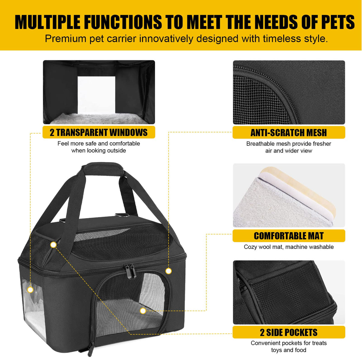 ???CARRIER SIZE? Length: 17” Width: 11.8” Height: 13”. The cat carrier is designed for higher height, the wider width, the more space for your lovely pets. So that our medium pet carrier is fit for one large cat, two small kittens, one or two small doggies. The maximum weight is 20 lbs. Please do measurement before you add to your cart. | ???OEKO-TEX STANDARD 100 CERTIFIED?Our soft sided cat carrier are all gained the ‘’OEKO-TEX STANDARD 100’’ certification, which means our medium cat carrier is non-smelly, mild, non-stimulating, and friendly to your lovely cats & dogs. It’s our honor and duty to provide the best products to you and your pets. | ???CUSTOMIZED DESIGN & DURABLE?In order to make our pets have a more comfortable environment, we design the soft-sided cat carrier to be higher, and at the same time have side ventilation windows to make the ventilation inside the travel cat carrier better. Your pets will have enough space to lay down, stand up, switch positions, and feel less trapped. When you are not using the carrier, the whole thing folds down to save space. | ???FULLY FUNCTIONAL?The mesh-paneled and transparent window carrier provides good ventilation and offers a chance for you to see your pet to make sure everything is okay. Contains a removable plush bed to provide comfort for your companion. Equipped with adjustable shoulder straps, a safety harness, and a locking zipper to keep your pup safe. | ???AIRLINE APPROVED CARRIER? With an airline-approved design, you can take your pet to go to everywhere. It has a side strap that you can swipe over a rolling suitcase handle for securing the cat carrier. The pet backpack carrier provides more outdoor possibilities, such as traveling, riding, walking, camping, hiking, and more outdoor activities.