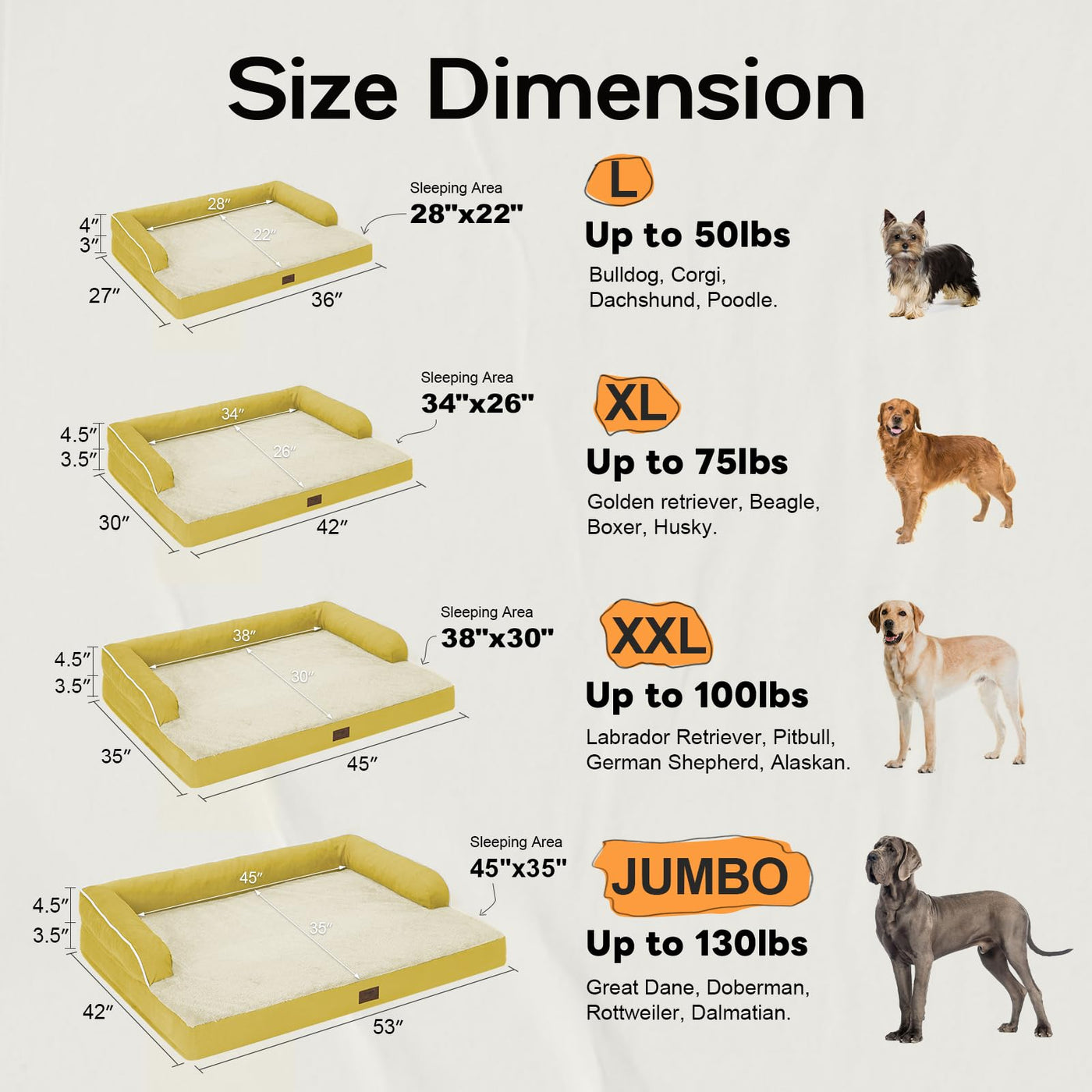 ?Size Guide? The ginger dog bed (36x27x7 inches) is suitable for dogs weighing up to 50 pounds such as Newfoundlands Bernards etc; for dogs that enjoy rolling around or need extra space sizing up will provide greater comfort