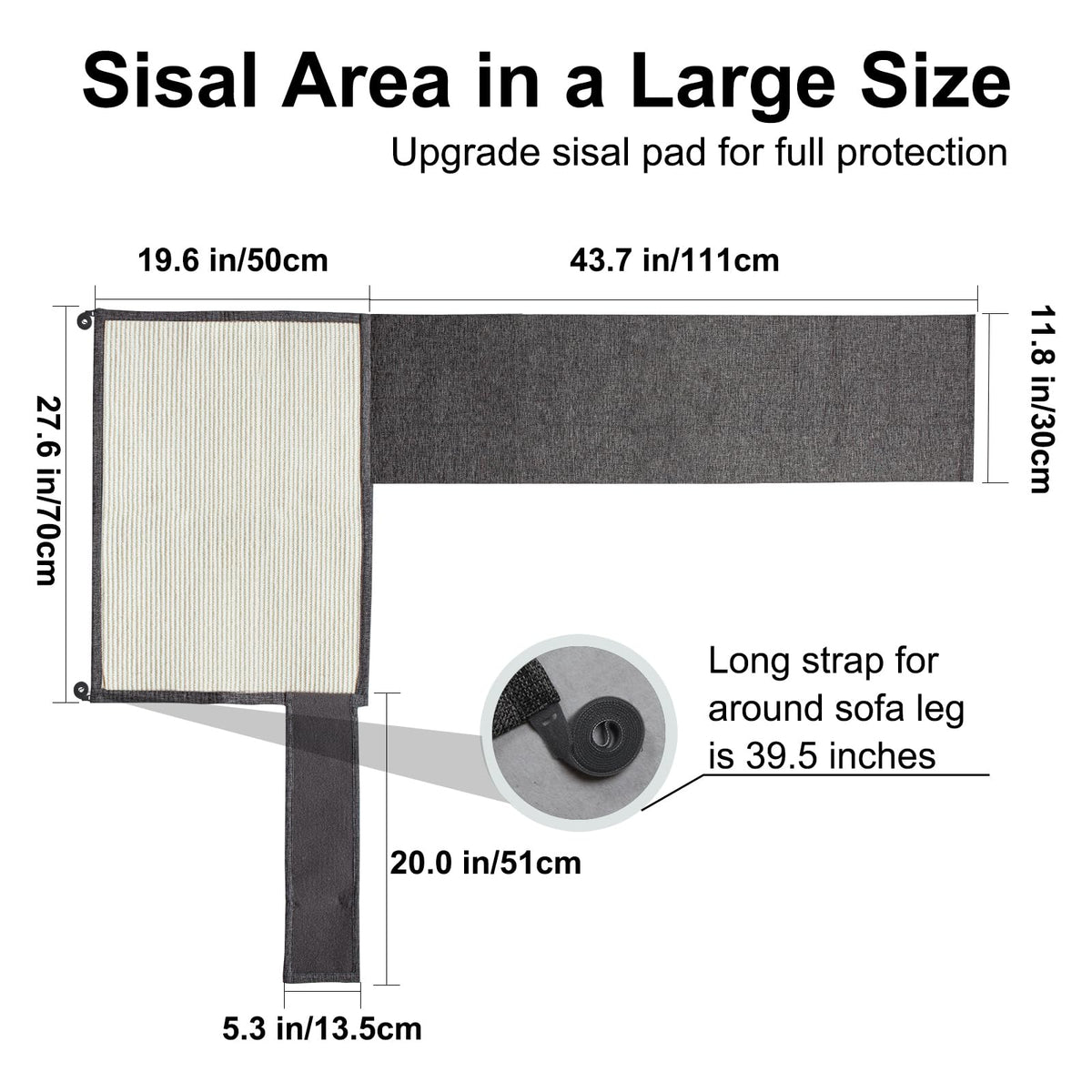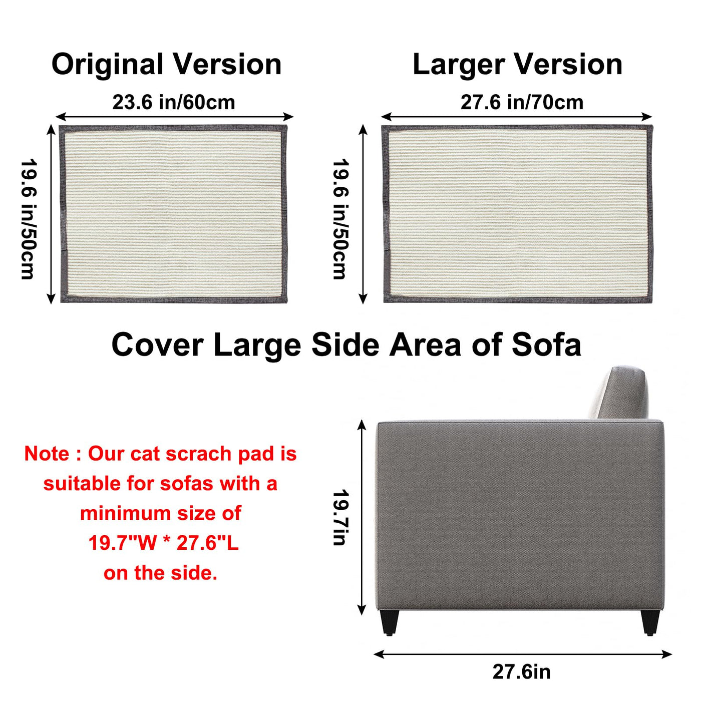 High-Quality MaterialOur sctratching mat is made of high quality nature sisal fabric which is eco-friendlyIts a best choice for furry friendsThe flexibility and practical design makes it convenient to use cover Large Size AreaThe Sisal Mat is 275inch*196inch which is larger than beforeIt can protect big side area at least 275inch L*196inch WPlease be sure your sofa area size before you purchase urniture Protectionrotect your furniture from cat scratches and let your cat enjoy scratchingAlso you do not worry the sctraches any longer even if you are not home claw carearge size to protect your sofa and furniture with sisal and fabricYour cat can sharpen its claws while couch remains protectedSave your sofa and money Quick InstallationThe sofa protector is easy to intall and it can be placed with ease on sofa or other furnitureIt do not affect the beauty of furniture for it can blend into the decoration nicely Warm Tipslease mind the right hand is the side when you are sitting on the couchIf you donAt have flatsquare arms on your couch it wonAt be very stableAlso it do not fit wing arm sofa extra thick arm and wood arm sofaIt also do not fit the sofa which cushion can not be lifted