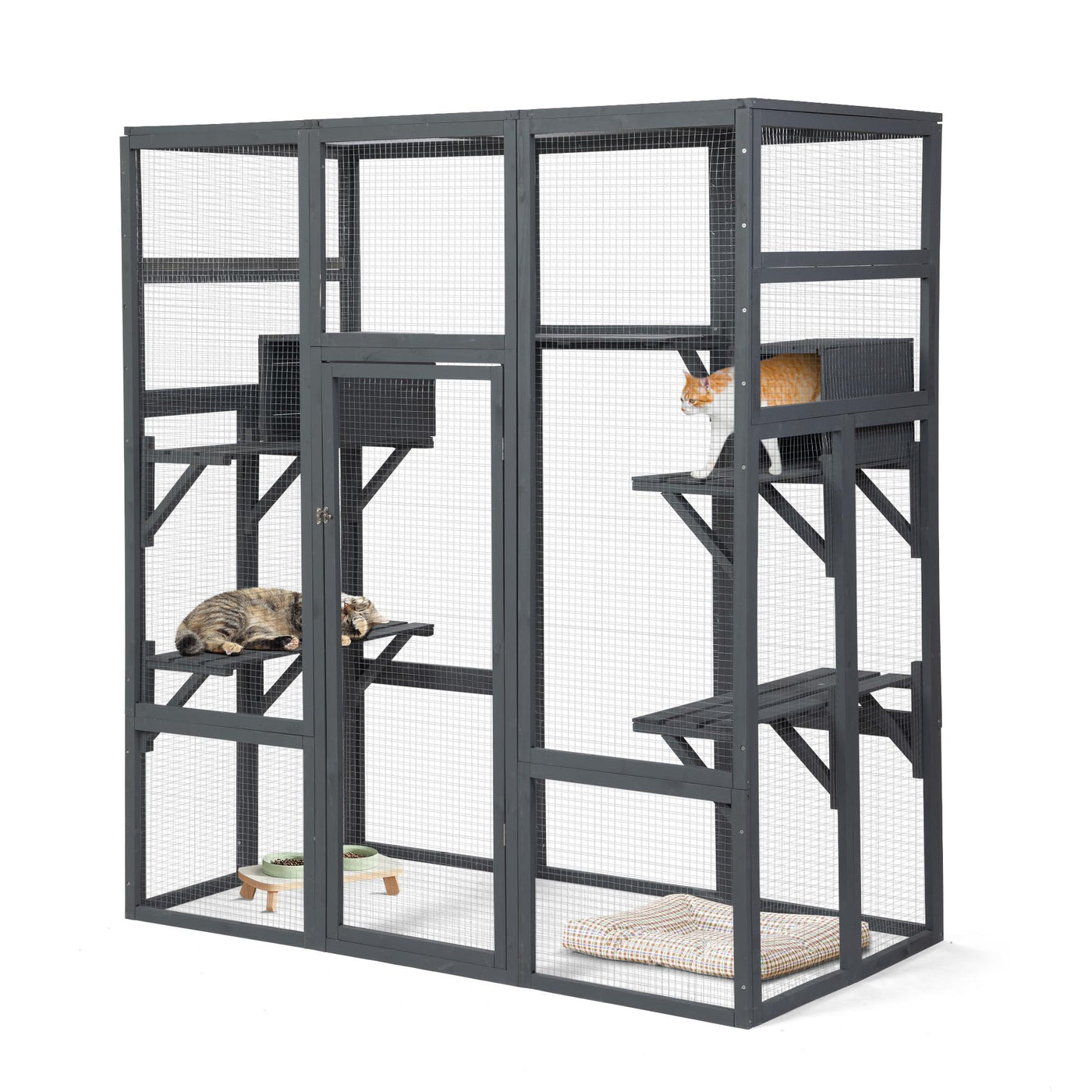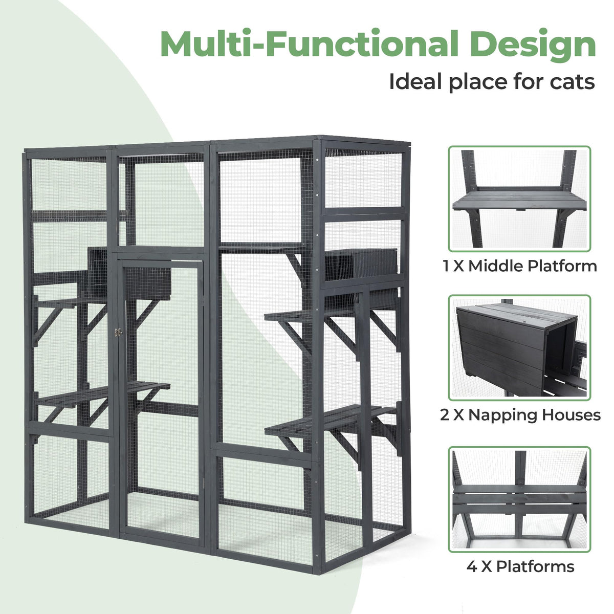 Large Catio For Cats To Play Relax Safely Indoor & Outdoorenjoy Playtime With Your Kitty Under The Warm Sunshinedoes Your Cat Long To Play Outdoors With More Space?This Large Wooden Cat Catio Will Not Only Satisfy Your Feline Friends But Also Will Meet Your Needs.With Ample Activity Space, Your Multiple Kitties Can Climb And Jump With The Platforms, And Sleep In The Private Condos. The Wire-Mesh Enclosure Allows You To Observe Your Pets Outside Without Disturbance.1. Catio Accessories For Cats To Play And Relax Safely Indoors And Outdoors2. Sturdy Wooden Structure With Wire Mesh Enclosure For Durability3. A Waterproof Roof For Sunshine Enjoyment And Weather Resistancespecifications:Color: Greymaterial: Fir + Galvanized Wire Mesh + Polycarbonate Hollow Topoverall Dimensions: 62.5''L X 32.5''W X 70''Htop Sunlight Panel Dimensions: 31.5''L X 19.25''W X 0.25''T(Thick)Platform Dimensions: 20.75''L X 10''W X 0.25''T(Thick); 15''L X 10''W X 0.25''T(Thick)Door Dimensions: 18.5''W X 48.75''Hretreat House Dimensions: 15.25''L X 10.75''W X 9.75''Hnet Weight: 64 Lbsfeatures:Weatherproof Structure: Leak Proof Pp Sheet Roof Reinforced With Durable Wooden Strips.Platform To Meet Cats Nature: 7 Platforms For Multiple Cats To Climb, Jump, And Relax.Strong Galvanized Mesh: Sturdy Wooden Structure With Wire Mesh Enclosure For Durability.Safe & Reliable: Equipped With A Door With Latches For Easy Access And Security.A Great Addition To Your Patio Or Backyard!