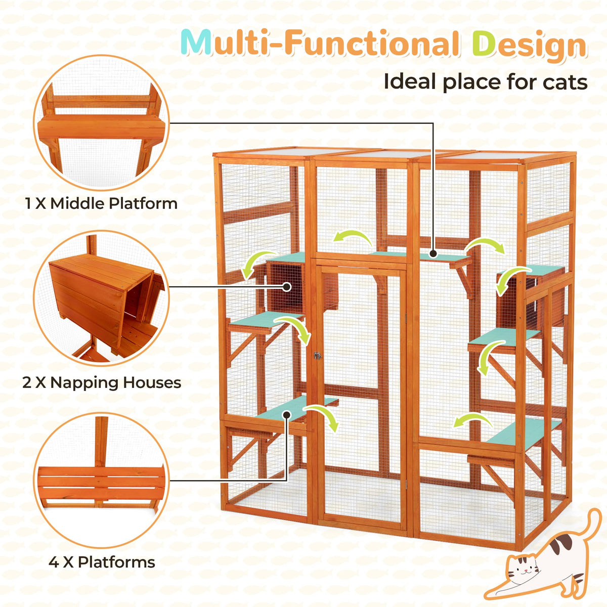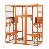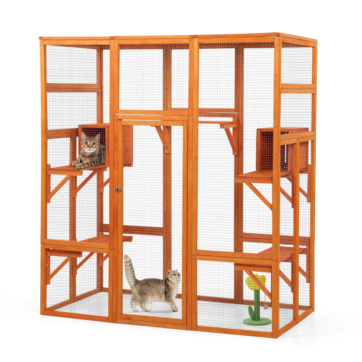 Large Catio For Cats To Play Relax Safely Indoor & Outdoorenjoy Playtime With Your Kitty Under The Warm Sunshinedoes Your Cat Long To Play Outdoors With More Space?This Large Wooden Outdoor Catio Will Not Only Satisfy Your Feline Friends But Also Will Meet Your Needs.With Ample Activity Space, Your Multiple Kitties Can Climb And Jump With The Platforms, And Sleep In The Private Condos. The Wire-Mesh Enclosure Allows You To Observe Your Pets Outside Without Disturbance.1. Large Catio For Cats To Play And Relax Safely Indoors And Outdoors2. Sturdy Wooden Structure With Wire Mesh Enclosure For Durability3. A Waterproof Roof For Sunshine Enjoyment And Weather Resistancespecifications:Color: Orangematerial: Fir + Galvanized Wire Mesh + Polycarbonate Hollow Topoverall Dimensions: 62.5''L X 32.5''W X 70''Htop Sunlight Panel Dimensions: 31.5''L X 19.25''W X 0.25''T(Thick)Platform Dimensions: 20.75''L X 10''W X 0.25''T(Thick); 15''L X 10''W X 0.25''T(Thick)Door Dimensions: 18.5''W X 48.75''Hretreat House Dimensions: 15.25''L X 10.75''W X 9.75''Hnet Weight: 64 Lbsfeatures:Weatherproof Structure: Leak Proof Pp Sheet Roof Reinforced With Durable Wooden Strips.Platform To Meet Cats Nature: 7 Platforms For Multiple Cats To Climb, Jump, And Relax.Strong Galvanized Mesh: Sturdy Wooden Structure With Wire Mesh Enclosure For Durability.Safe & Reliable: Equipped With A Door With Latches For Easy Access And Security.A Great Addition To Your Patio Or Backyard,Catio Indoor Cat Enclosures Provide A Warm And Cosy Home For Your Pet Friend, And Your Kitty Will Spend Her Time In A Catio Accessories.