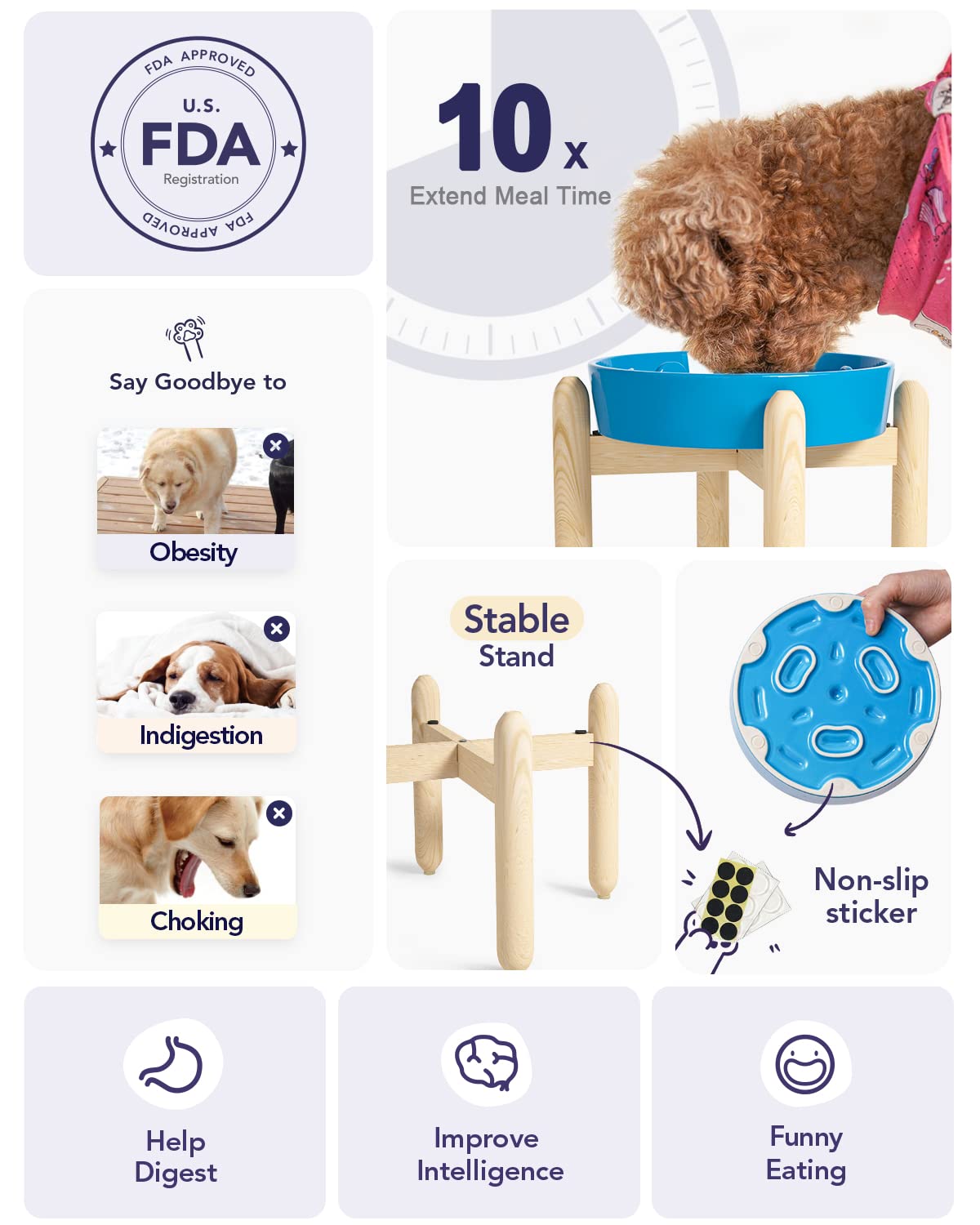 LE TAUCI Ceramic Slow Feeder Dog Bowls Elevated for Small and Medium Breed, Dog Bowls with Wooden Stand, 1.5 Cups Dog Dishes to Slow Down Eating, Anti-Gulping Pet Feeding Dishes, Vortex Blue
