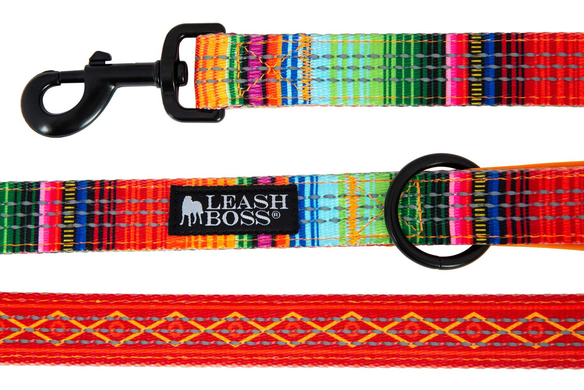 Add a pop of color to your pet accessories with this patterned dog leash from Leash Boss and matching accessories. Our collar and leash sets are bright, bold, and made to last. This serape blanket patterned product includes a rainbow of vibrant colors.