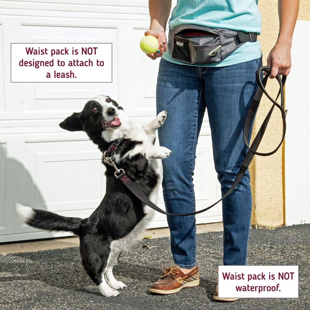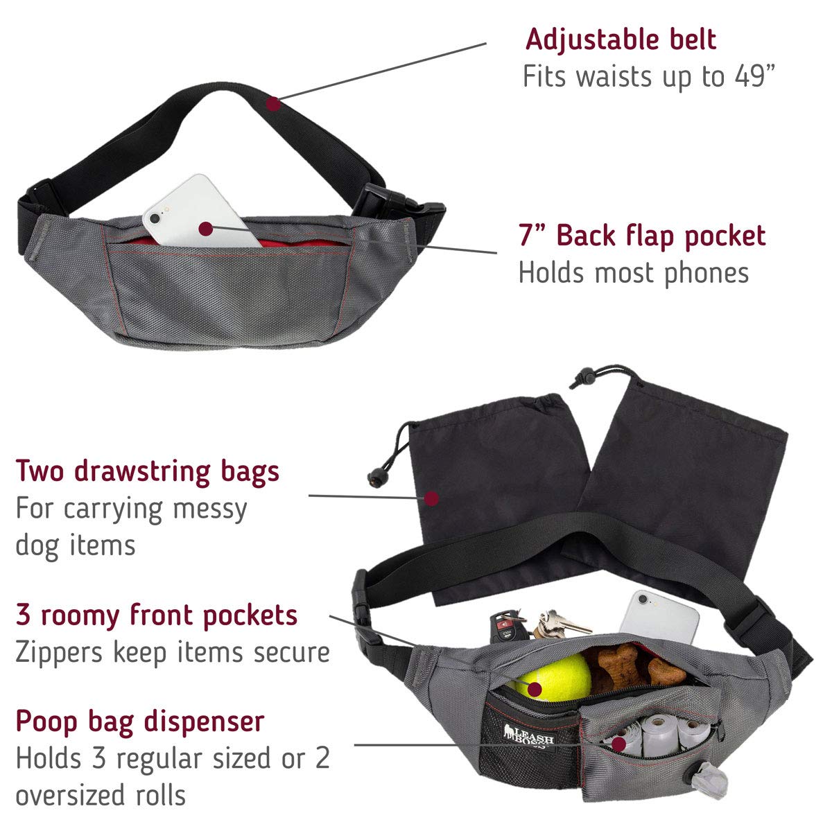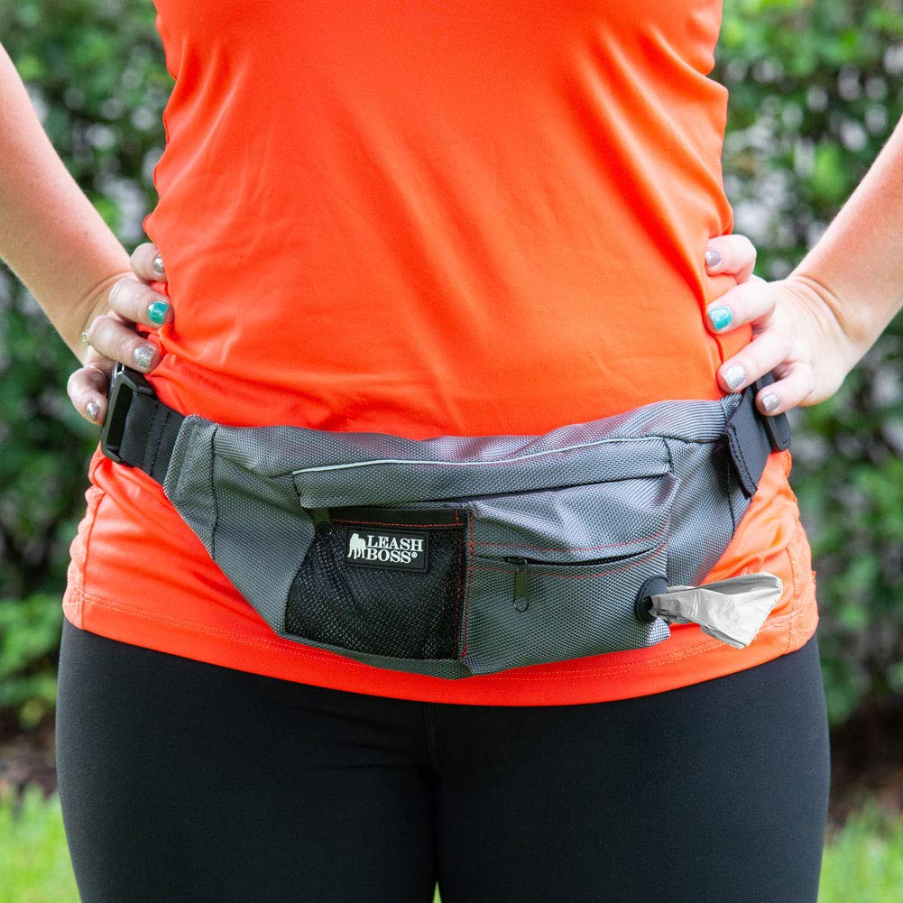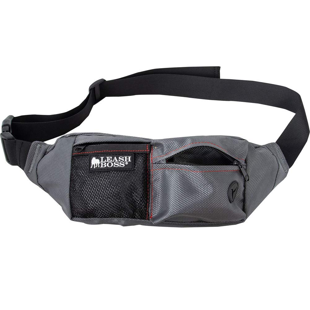 Say hello to the perfect dog walking fanny pack and treat pouch No pockets No problem This slim pack is a great choice for people who love to walk their dogs, but donAt have roomy pockets for carrying the essentials strong>Multiple Pockets for Multiple Usesstrong> The main pocket zips closed for added security It comes with two washable drawstring bags which can be used to store messy dog stuff - poop bags, muddy tennis balls, or anything else you donAt want to carry in your hands Front mesh pocket is great for holding training treats Front poop bag pouch with zipper closure fits three standard sized 15-bag rolls, or two oversized rolls strong>Holds Most Phonesstrong> The back of the fanny pack has an oversized unzippered pouch measures 7A wide and will hold most phones including: iPhone 66s6+77+88+XXRXS MaxXS and Samsung galaxy S10S10eS10+A80 strong>Modern LookNot Bulkystrong> This streamlined gray dog walking belt is durable and lightweight Stylish design features include a red nylon interior and black mesh exterior pocket It coordinates with all of your favorite Leashboss brand leashes and other accessories Please note: This product is not waterproof It will provide some protection during light drizzle, but not heavy rain showers Waist pack is NOT designed to attach to a leash strong>Adjustable Waist Beltstrong> Our adjustable waist belt is designed to fit waists up to 49A The strong buckle and durable nylon belt will stay in place and keep to the right size You donAt have to worry about the belt slipping if you fill up the pack Please note: A leash cannot be clipped or attached to this fanny pack strong>5 Year Manufacturers Warrantystrong> Backed by AThe Boss PromiseA our 5-year manufacturerAs warranty WeAre confident this durable design will stand the test of time