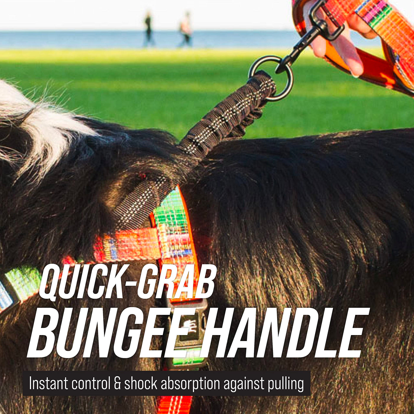 Q: How does the bungee clip feature enhance the harness's functionality?A: The bungee clip design absorbs shock, making it ideal for strong pullers. This feature allows for safer playtime and more comfortable long-leash training, reducing strain on your dog's neck during walks.