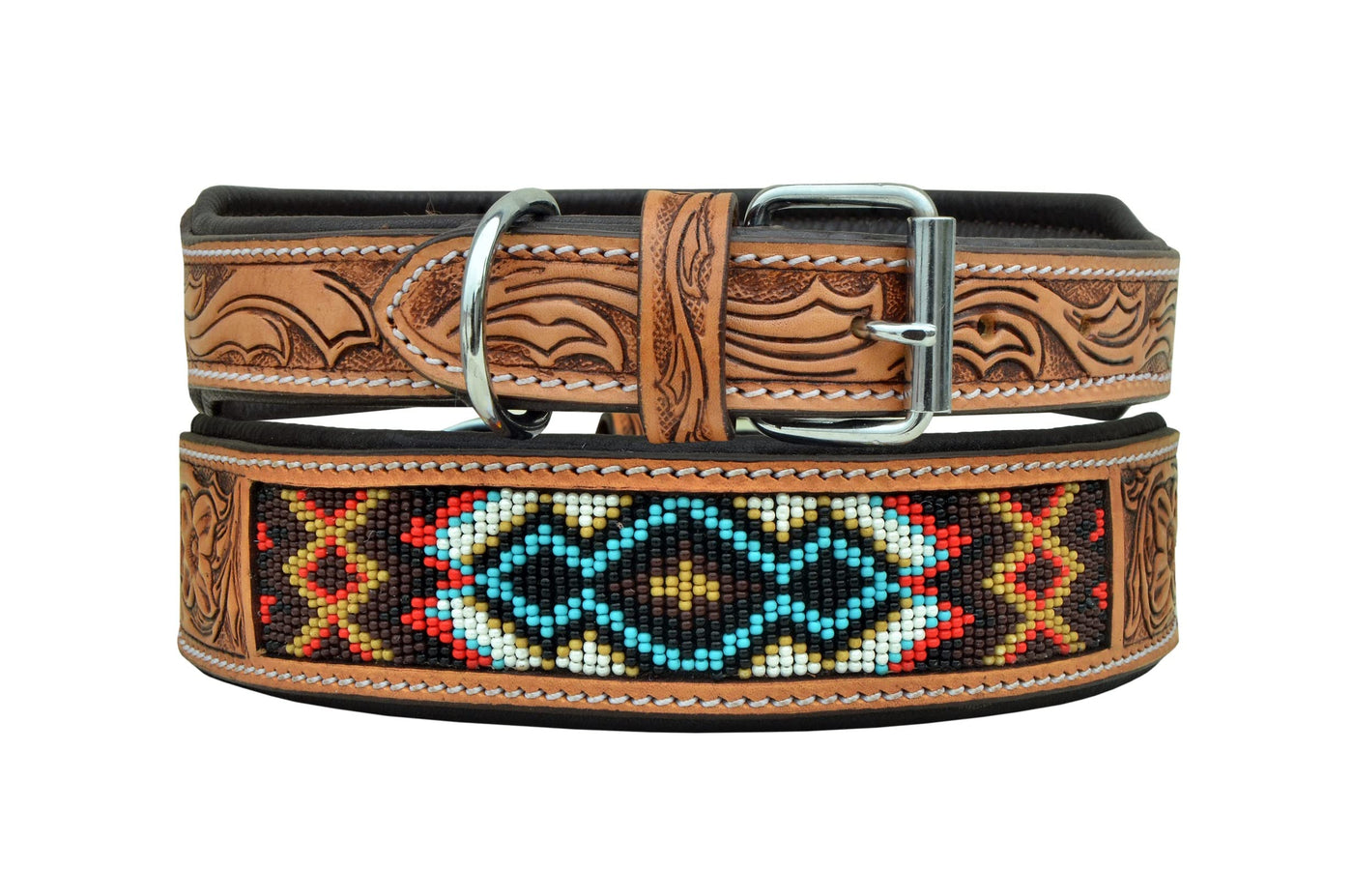 Leather Dog Collar Extra Small Size Western Style Heavy Duty Hand Tooled Adjustable Beaded And Padded Soft For Puppies And Big D