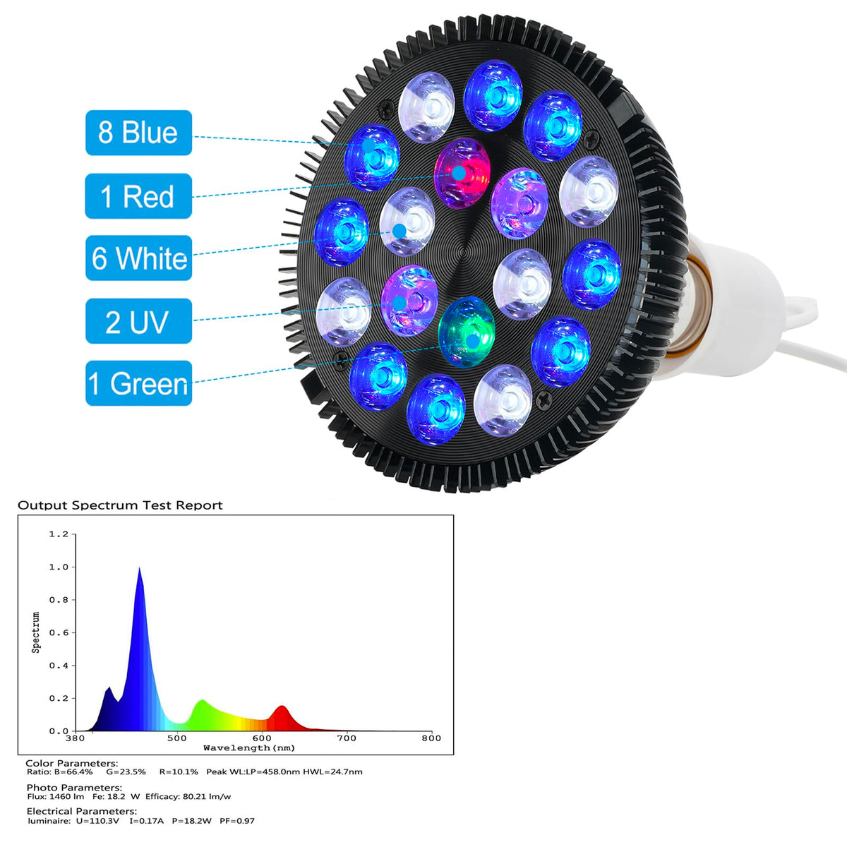 LED Aquarium Lights Bulb 18W Saltwater Fish Tank Light Full Spectrum Aquatic Plants Grow Lamp Refugium Light with UV Blue White