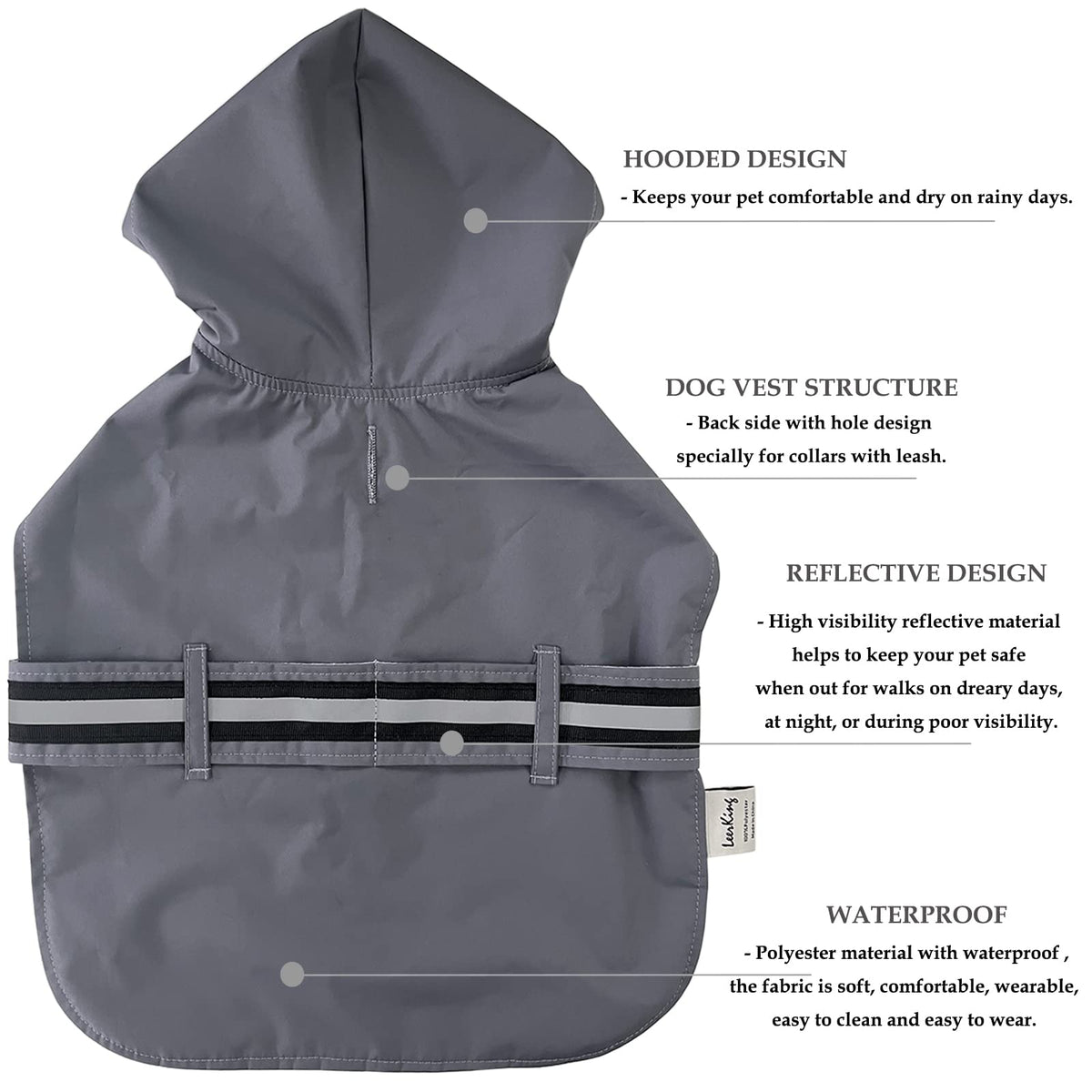Leerking Dog Raincoat Hooded Leash Hole 10 Sizes, Waterproof Double Layer Dog Rain Coat Jacket With Cotton Lining For Small Medium And Large Dog,Grey,Xl
