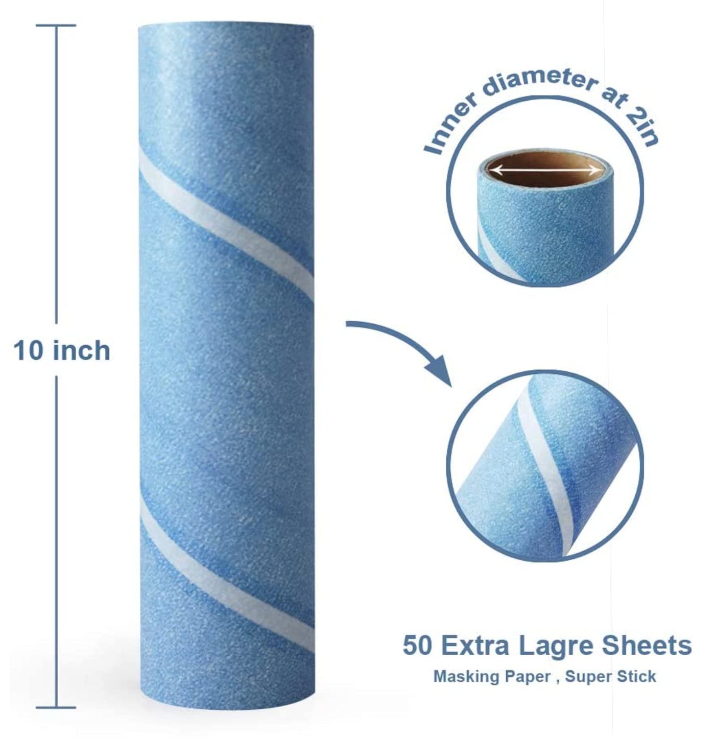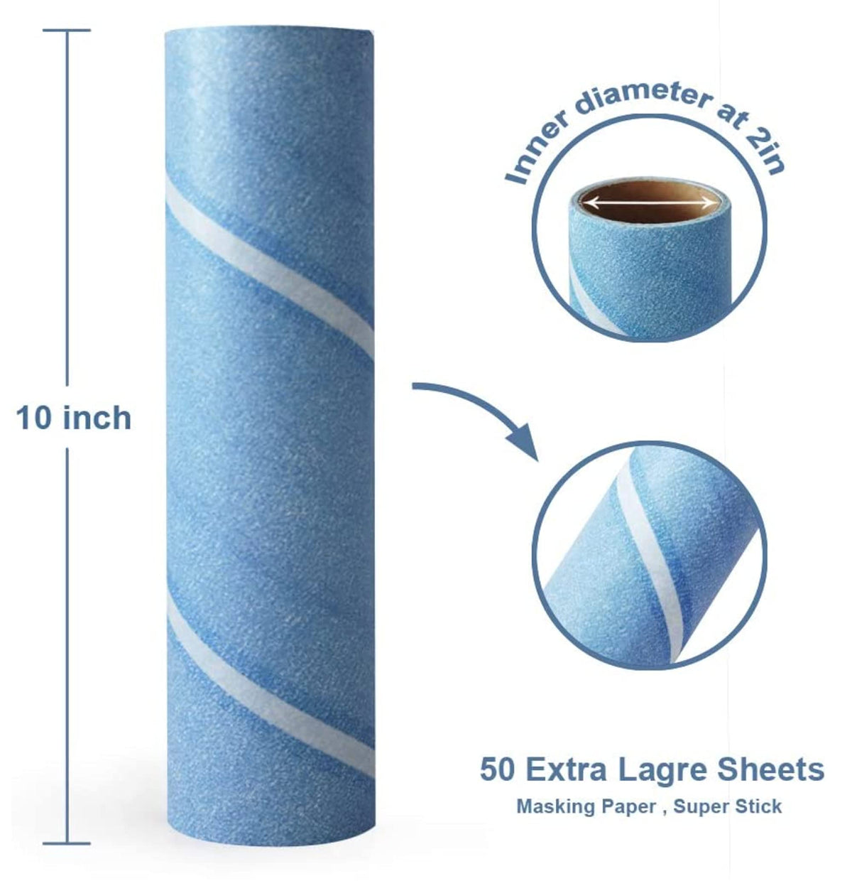 Q: What is the size of the lint sheets in this roller?A: Each refill pack contains 50 ultra-wide sheets measuring 10 inches in width, providing ample coverage for quick and efficient cleaning.