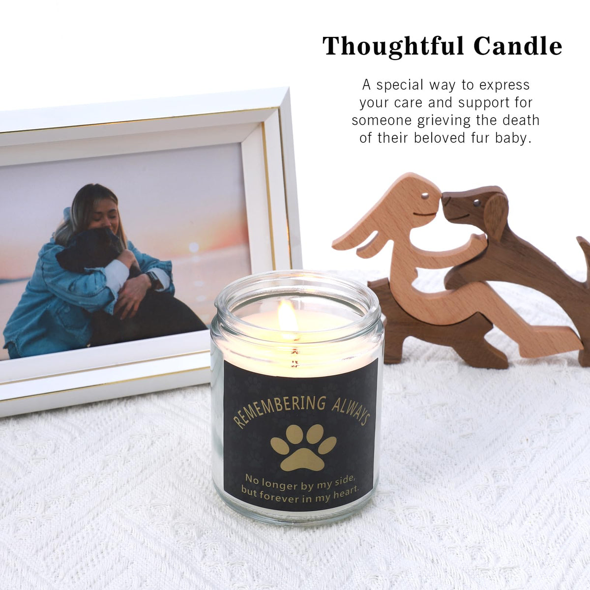 Q: How can the soy candle help in coping with pet loss?A: The soy candle provides a sense of comfort and relaxation during difficult times. Lighting it can create a soothing atmosphere and serves as a gentle reminder of the love shared with the pet, making it a thoughtful addition to the sympathy gift.