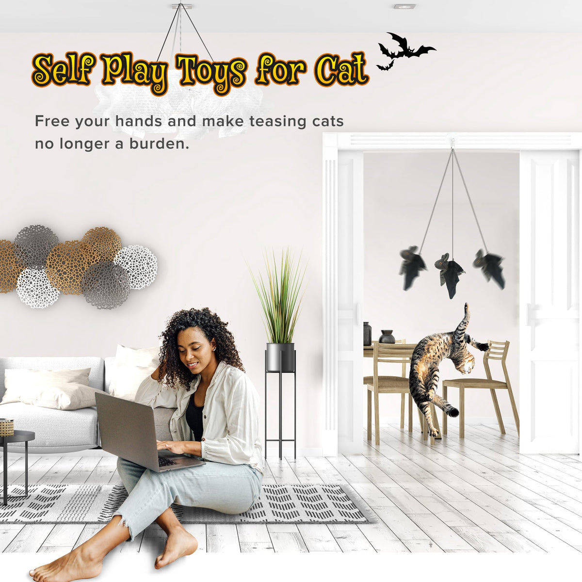 Match with Cat Teaser Stick:This intelligent flapping wings bat cat toy has a rope buckle design on the back suitable for use with a cat teaser stick so you can interact with your beloved kittens and enjoy the fun of cat fishing! Self-adhesive hook and elastic rope are also included in the package which can be used to hang toys on door frames and automatically tease cats.