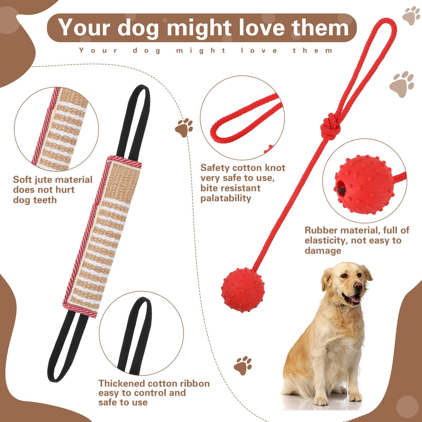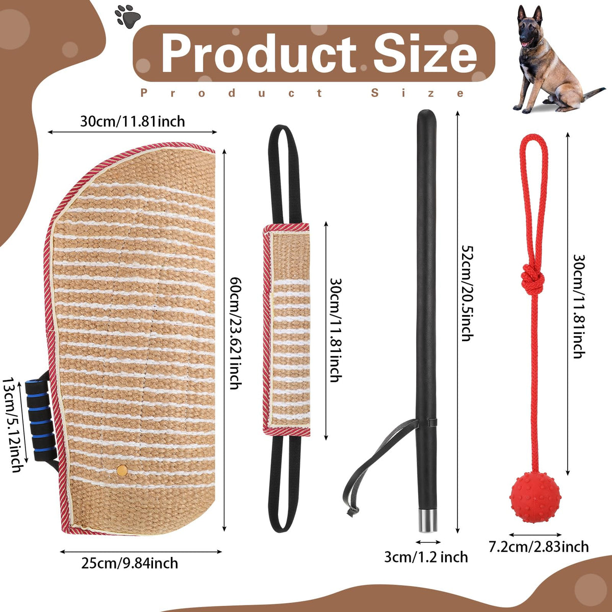 Features: Nice Gifts: The Dog Agility Training Set Is Suitable For Sending To Your Friends, Colleagues, Relatives, Neighbors, Family Members And Others You Care And Love, They Will Be Happy To Receive This Gift. Warm Note: This Dog Exercise Equipment Is Sturdy, But No Toy Is Indestructible. Use Only For Interactive Traction Between You And Your Dog, Not Chew Toys At The End Of The Interaction, Do Not Let Your Dag Keep The Toy And Do Not Let Him Chew The Handle. Specifications: Material: Dog Chew Sleeve, Dog Chew Tug Toy: Jute Outer Layer And Thick Cotton Inner Layerdog Training Stick: Artificial Leatherdog Chew Rubber Ball: Rubber Color: As Shown On The Picturesize: Dog Chew Sleeve: Approx. 23.6 X 11.8 Inches/ 60 X 30 Cmdog Chew Tug Toy: Approx. 11.8 X 3.15 Inches/ 30 X 8 Cmdog Training Stick: Approx. 20.5 X 1.2 Inches/ 52 X 3 Cmdog Chew Rubber Ball: Approx. 2.8 Inches/ 7.2 Cm In Diameterpackage Includes: 1 X Dog Chew Sleeve1 X Dog Chew Tug Toy1 X Dog Training Stick1 X Dog Chew Rubber Ballnotes: Manual Measurement, Please Allow Slight Errors On Size. The Color May Exist A Slight Difference Due To Different Screen Displays.