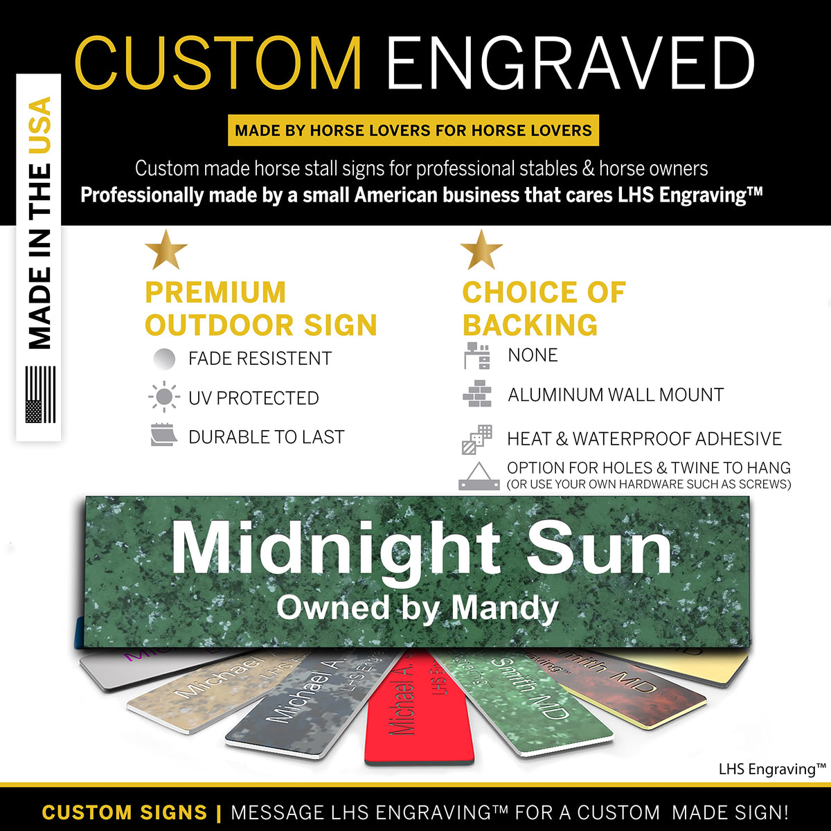 Barns, Stables And Trailers Are All Needed For Your Horse And Or Your Boarding Facility And A Horse Name Plate Is No Different. You Simply Just Need A Personalized Stall Plaque That Will Work And Looks Professional. Not Only For Yourself, Employees, But To Show Off Your Barn To Your Clients. But Also For These Animals We All Love.This Horse Stall Sign Is Made Specifically For Your Stable. You Could Use Office Name Plate Of Course. But Not All Are The Same. You Need A Ranch Sign Meant To Be Used Outside That Won'T Degrade Due To Temperature, Moisture, And Uv Rays And Will Hold Up Nice In Outdoors. A Properly Engraved Name Plate Is Important As You Need It To Be Engraved With The Pedigree, And/Or The Horses Name, (In Larger Characters) And The Horse Owner (In Smaller Characters). And Of Course You Need One That Looks Good So You Can Show It Off To All Your Neiiiiighbours (Sorry, Couldn'T Help It) These Work Great To Also Be Used With A Horse Trailer, Hang It Up At A Horse Show, Or Even To Customize A Utility Box. Either Way, This Is A Dedicated Indoor/Outdoor Horse Stall Name Plate That Will Look Just As Beautiful In Your Barn As Your Horse Does.