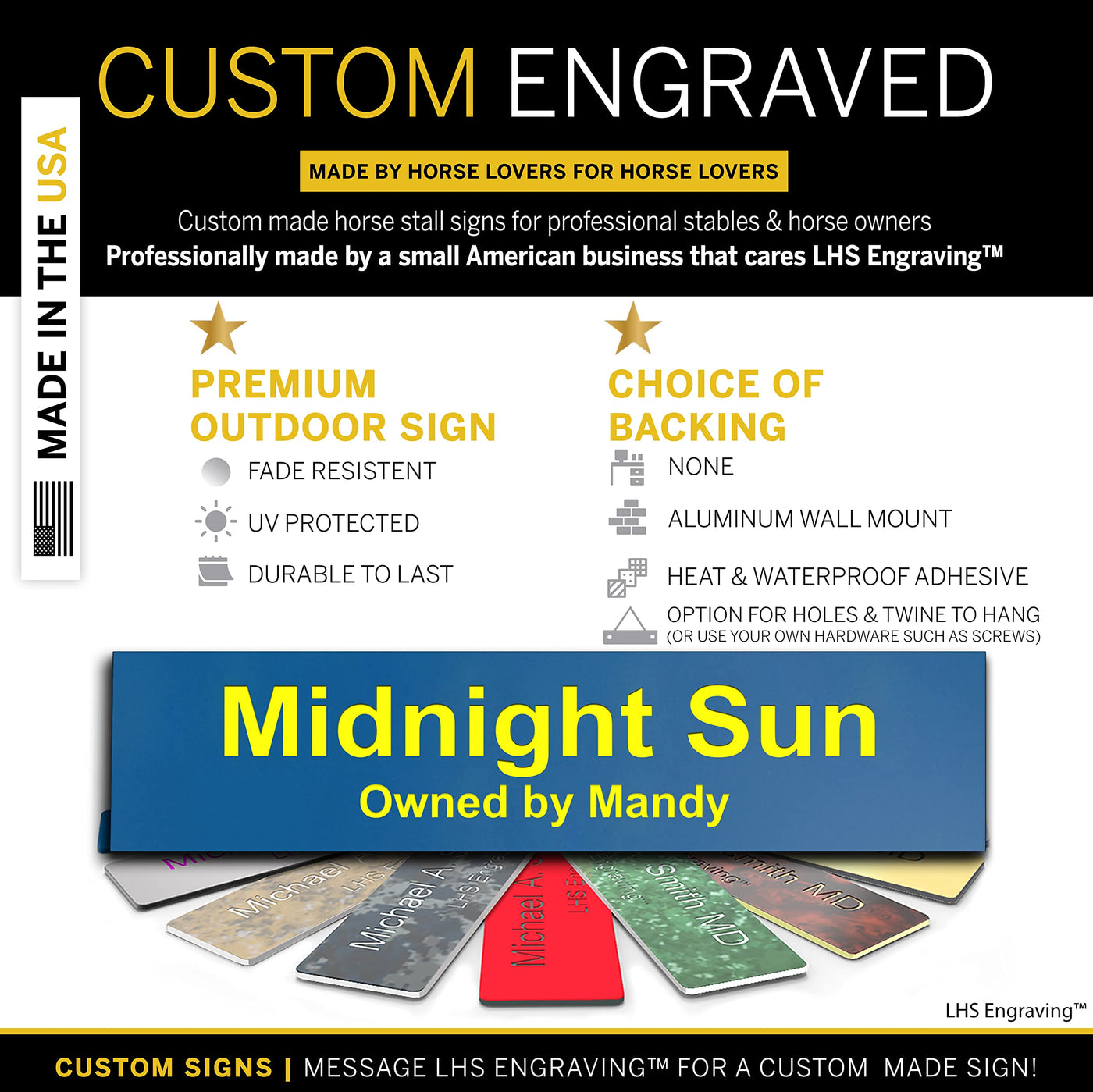 Barns, Stables And Trailers Are All Needed For Your Horse And Or Your Boarding Facility And A Horse Name Plate Is No Different. You Simply Just Need A Personalized Stall Plaque That Will Work And Looks Professional. Not Only For Yourself, Employees, But To Show Off Your Barn To Your Clients. But Also For These Animals We All Love.This Horse Stall Sign Is Made Specifically For Your Stable. You Could Use Office Name Plate Of Course. But Not All Are The Same. You Need A Ranch Sign Meant To Be Used Outside That Won'T Degrade Due To Temperature, Moisture, And Uv Rays And Will Hold Up Nice In Outdoors. A Properly Engraved Name Plate Is Important As You Need It To Be Engraved With The Pedigree, And/Or The Horses Name, (In Larger Characters) And The Horse Owner (In Smaller Characters). And Of Course You Need One That Looks Good So You Can Show It Off To All Your Neiiiiighbours (Sorry, Couldn'T Help It) These Work Great To Also Be Used With A Horse Trailer, Hang It Up At A Horse Show, Or Even To Customize A Utility Box. Either Way, This Is A Dedicated Indoor/Outdoor Horse Stall Name Plate That Will Look Just As Beautiful In Your Barn As Your Horse Does.