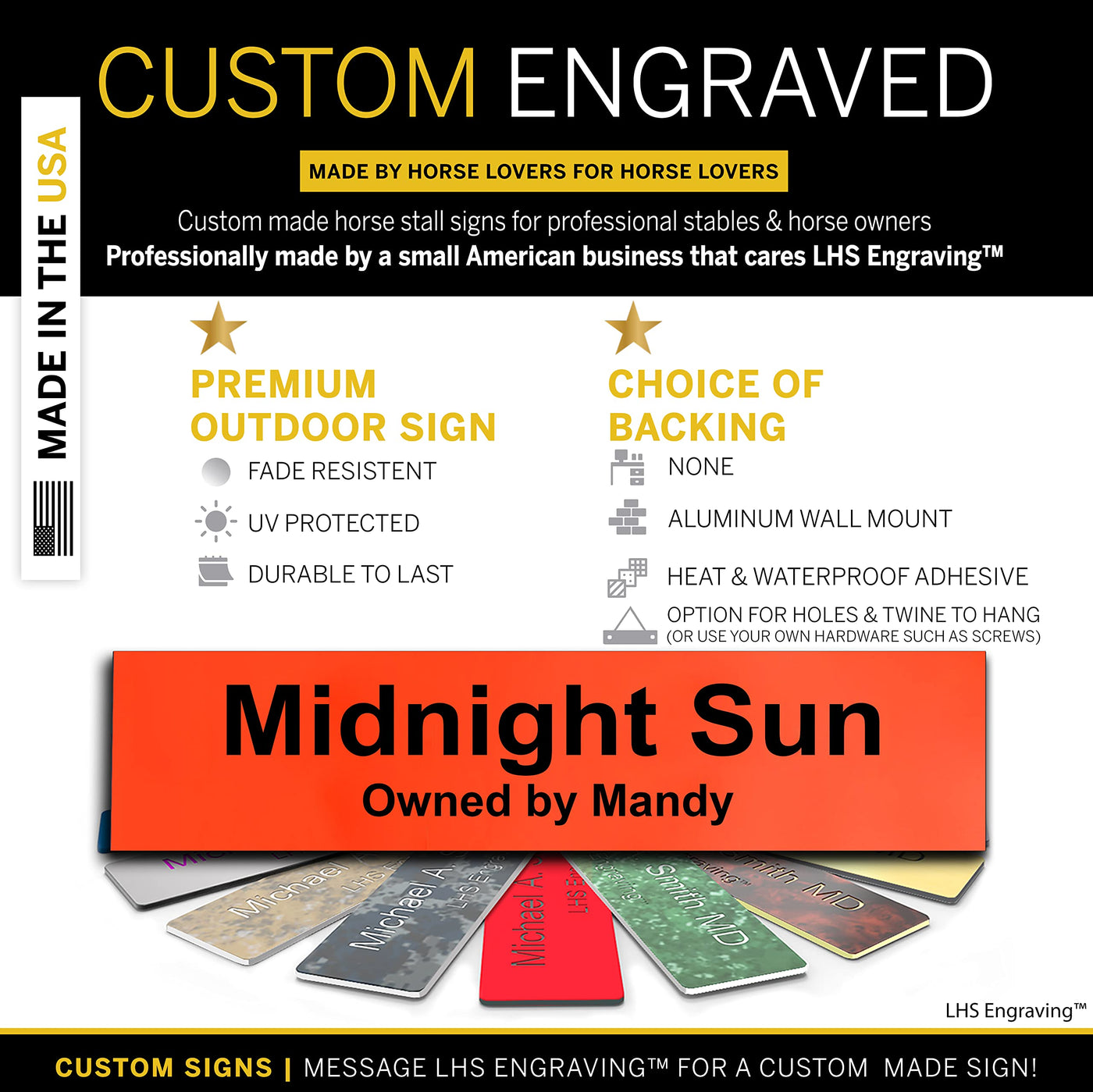 Barns, Stables And Trailers Are All Needed For Your Horse And Or Your Boarding Facility And A Horse Name Plate Is No Different. You Simply Just Need A Personalized Stall Plaque That Will Work And Looks Professional. Not Only For Yourself, Employees, But To Show Off Your Barn To Your Clients. But Also For These Animals We All Love.This Horse Stall Sign Is Made Specifically For Your Stable. You Could Use Office Name Plate Of Course. But Not All Are The Same. You Need A Ranch Sign Meant To Be Used Outside That Won'T Degrade Due To Temperature, Moisture, And Uv Rays And Will Hold Up Nice In Outdoors. A Properly Engraved Name Plate Is Important As You Need It To Be Engraved With The Pedigree, And/Or The Horses Name, (In Larger Characters) And The Horse Owner (In Smaller Characters). And Of Course You Need One That Looks Good So You Can Show It Off To All Your Neiiiiighbours (Sorry, Couldn'T Help It) These Work Great To Also Be Used With A Horse Trailer, Hang It Up At A Horse Show, Or Even To Customize A Utility Box. Either Way, This Is A Dedicated Indoor/Outdoor Horse Stall Name Plate That Will Look Just As Beautiful In Your Barn As Your Horse Does.