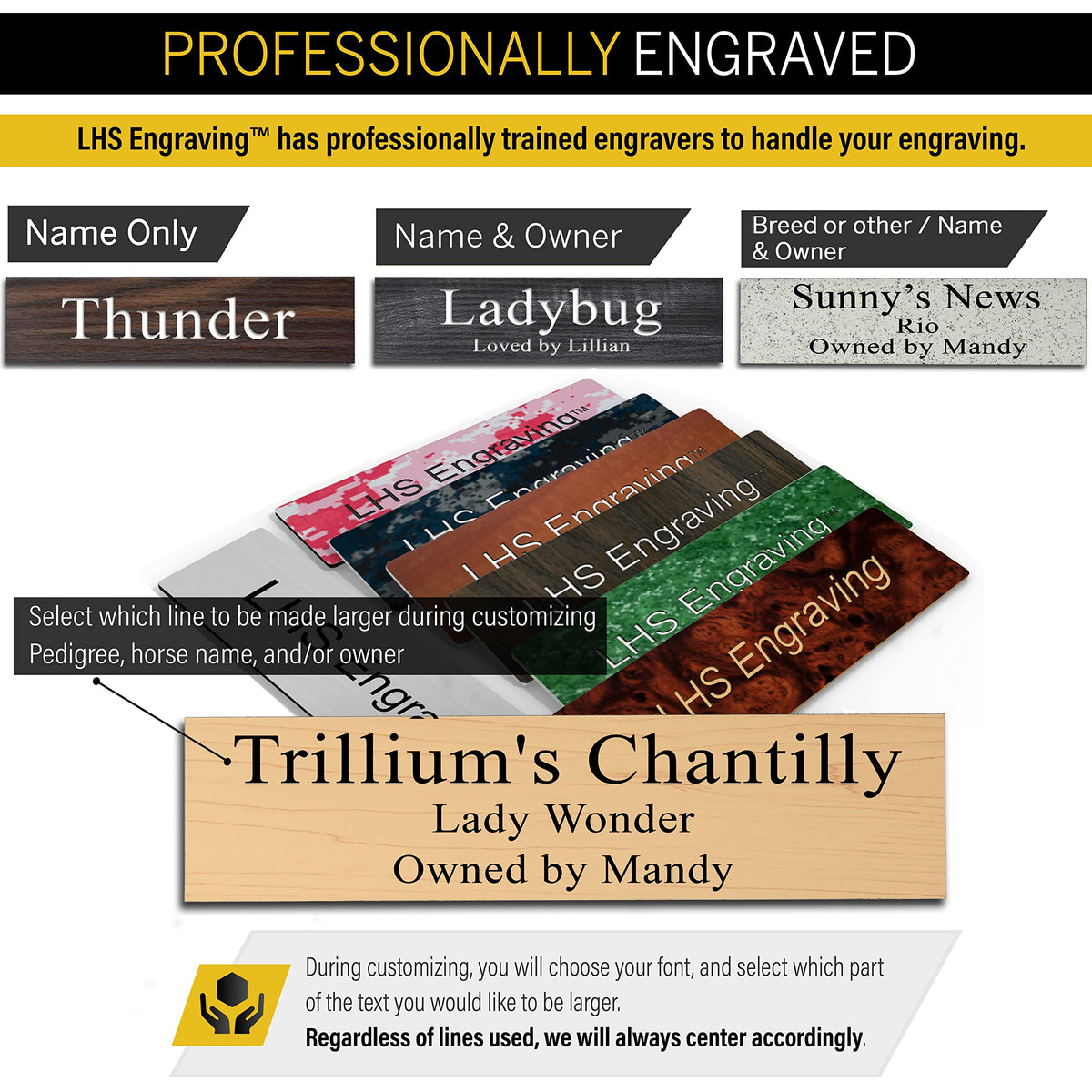 Barns, Stables And Trailers Are All Needed For Your Horse And Or Your Boarding Facility And A Horse Name Plate Is No Different. You Simply Just Need A Personalized Stall Plaque That Will Work And Looks Professional. Not Only For Yourself, Employees, But To Show Off Your Barn To Your Clients. But Also For These Animals We All Love.This Horse Stall Sign Is Made Specifically For Your Stable. You Could Use Office Name Plate Of Course. But Not All Are The Same. You Need A Ranch Sign Meant To Be Used Outside That Won'T Degrade Due To Temperature, Moisture, And Uv Rays And Will Hold Up Nice In Outdoors. A Properly Engraved Name Plate Is Important As You Need It To Be Engraved With The Pedigree, And/Or The Horses Name, (In Larger Characters) And The Horse Owner (In Smaller Characters). And Of Course You Need One That Looks Good So You Can Show It Off To All Your Neiiiiighbours (Sorry, Couldn'T Help It) These Work Great To Also Be Used With A Horse Trailer, Hang It Up At A Horse Show, Or Even To Customize A Utility Box. Either Way, This Is A Dedicated Indoor/Outdoor Horse Stall Name Plate That Will Look Just As Beautiful In Your Barn As Your Horse Does.