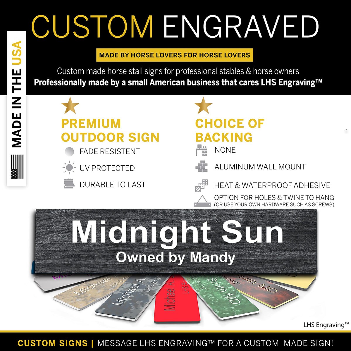 Barns, Stables And Trailers Are All Needed For Your Horse And Or Your Boarding Facility And A Horse Name Plate Is No Different. You Simply Just Need A Personalized Stall Plaque That Will Work And Looks Professional. Not Only For Yourself, Employees, But To Show Off Your Barn To Your Clients. But Also For These Animals We All Love.This Horse Stall Sign Is Made Specifically For Your Stable. You Could Use Office Name Plate Of Course. But Not All Are The Same. You Need A Ranch Sign Meant To Be Used Outside That Won'T Degrade Due To Temperature, Moisture, And Uv Rays And Will Hold Up Nice In Outdoors. A Properly Engraved Name Plate Is Important As You Need It To Be Engraved With The Pedigree, And/Or The Horses Name, (In Larger Characters) And The Horse Owner (In Smaller Characters). And Of Course You Need One That Looks Good So You Can Show It Off To All Your Neiiiiighbours (Sorry, Couldn'T Help It) These Work Great To Also Be Used With A Horse Trailer, Hang It Up At A Horse Show, Or Even To Customize A Utility Box. Either Way, This Is A Dedicated Indoor/Outdoor Horse Stall Name Plate That Will Look Just As Beautiful In Your Barn As Your Horse Does.