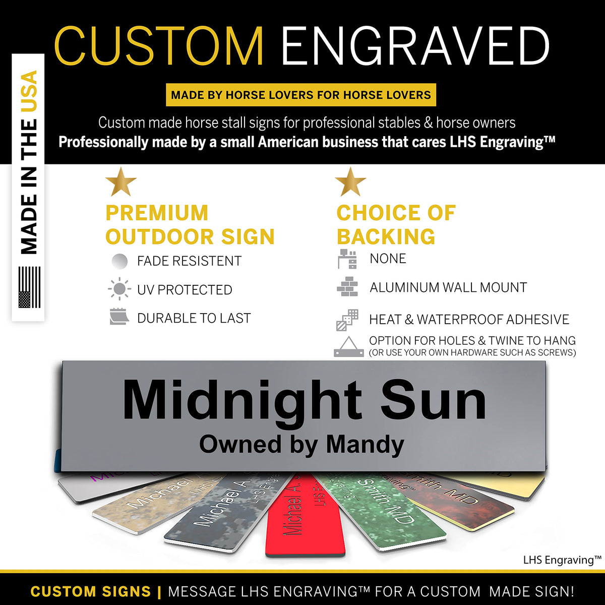 Barns, Stables And Trailers Are All Needed For Your Horse And Or Your Boarding Facility And A Horse Name Plate Is No Different. You Simply Just Need A Personalized Stall Plaque That Will Work And Looks Professional. Not Only For Yourself, Employees, But To Show Off Your Barn To Your Clients. But Also For These Animals We All Love.This Horse Stall Sign Is Made Specifically For Your Stable. You Could Use Office Name Plate Of Course. But Not All Are The Same. You Need A Ranch Sign Meant To Be Used Outside That Won'T Degrade Due To Temperature, Moisture, And Uv Rays And Will Hold Up Nice In Outdoors. A Properly Engraved Name Plate Is Important As You Need It To Be Engraved With The Pedigree, And/Or The Horses Name, (In Larger Characters) And The Horse Owner (In Smaller Characters). And Of Course You Need One That Looks Good So You Can Show It Off To All Your Neiiiiighbours (Sorry, Couldn'T Help It) These Work Great To Also Be Used With A Horse Trailer, Hang It Up At A Horse Show, Or Even To Customize A Utility Box. Either Way, This Is A Dedicated Indoor/Outdoor Horse Stall Name Plate That Will Look Just As Beautiful In Your Barn As Your Horse Does.