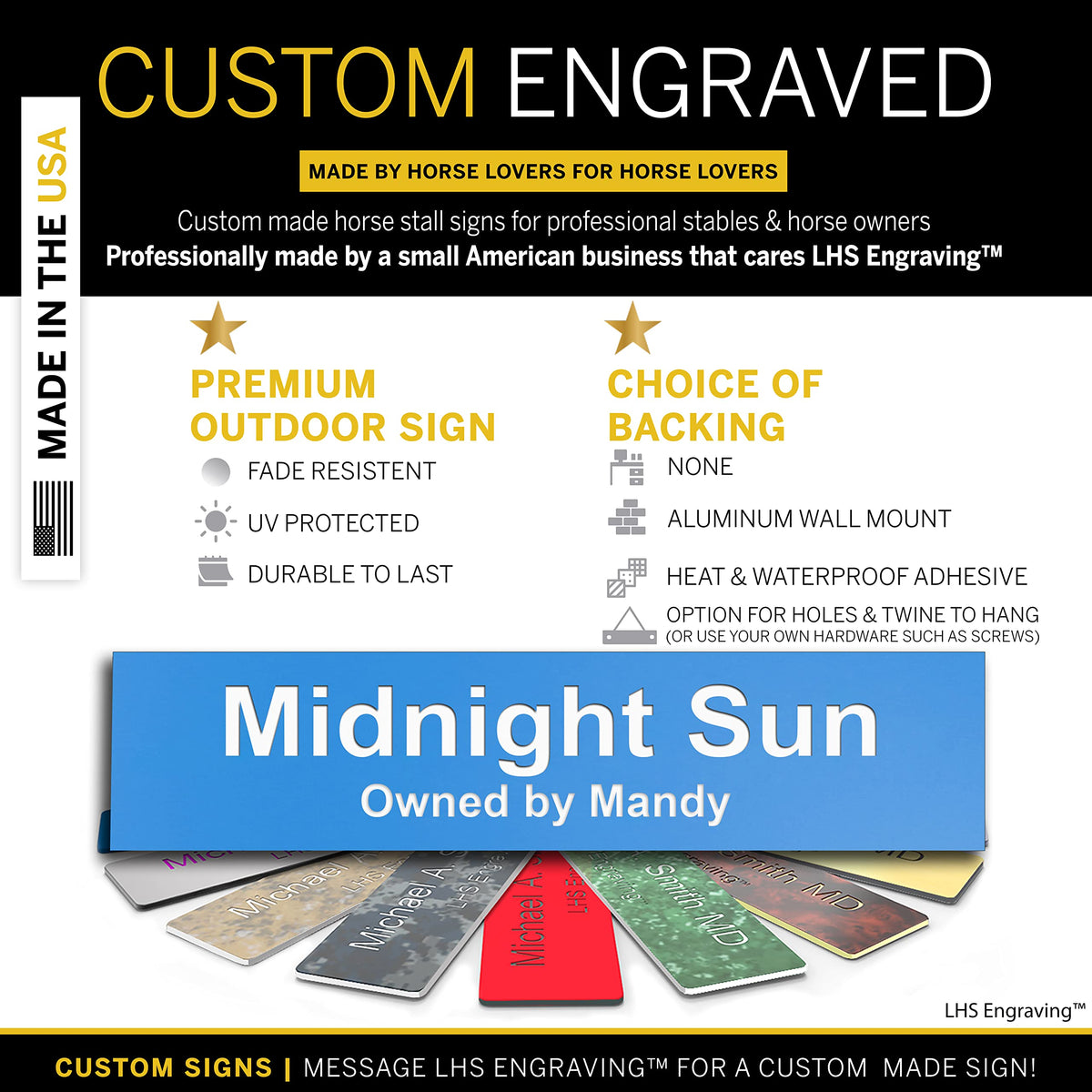 Barns, Stables And Trailers Are All Needed For Your Horse And Or Your Boarding Facility And A Horse Name Plate Is No Different. You Simply Just Need A Personalized Stall Plaque That Will Work And Looks Professional. Not Only For Yourself, Employees, But To Show Off Your Barn To Your Clients. But Also For These Animals We All Love.This Horse Stall Sign Is Made Specifically For Your Stable. You Could Use Office Name Plate Of Course. But Not All Are The Same. You Need A Ranch Sign Meant To Be Used Outside That Won'T Degrade Due To Temperature, Moisture, And Uv Rays And Will Hold Up Nice In Outdoors. A Properly Engraved Name Plate Is Important As You Need It To Be Engraved With The Pedigree, And/Or The Horses Name, (In Larger Characters) And The Horse Owner (In Smaller Characters). And Of Course You Need One That Looks Good So You Can Show It Off To All Your Neiiiiighbours (Sorry, Couldn'T Help It) These Work Great To Also Be Used With A Horse Trailer, Hang It Up At A Horse Show, Or Even To Customize A Utility Box. Either Way, This Is A Dedicated Indoor/Outdoor Horse Stall Name Plate That Will Look Just As Beautiful In Your Barn As Your Horse Does.