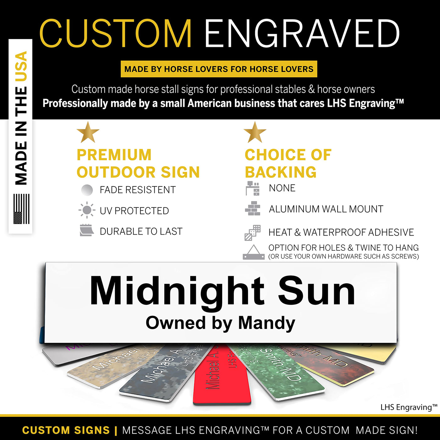 Barns, Stables And Trailers Are All Needed For Your Horse And Or Your Boarding Facility And A Horse Name Plate Is No Different. You Simply Just Need A Personalized Stall Plaque That Will Work And Looks Professional. Not Only For Yourself, Employees, But To Show Off Your Barn To Your Clients. But Also For These Animals We All Love.This Horse Stall Sign Is Made Specifically For Your Stable. You Could Use Office Name Plate Of Course. But Not All Are The Same. You Need A Ranch Sign Meant To Be Used Outside That Won'T Degrade Due To Temperature, Moisture, And Uv Rays And Will Hold Up Nice In Outdoors. A Properly Engraved Name Plate Is Important As You Need It To Be Engraved With The Pedigree, And/Or The Horses Name, (In Larger Characters) And The Horse Owner (In Smaller Characters). And Of Course You Need One That Looks Good So You Can Show It Off To All Your Neiiiiighbours (Sorry, Couldn'T Help It) These Work Great To Also Be Used With A Horse Trailer, Hang It Up At A Horse Show, Or Even To Customize A Utility Box. Either Way, This Is A Dedicated Indoor/Outdoor Horse Stall Name Plate That Will Look Just As Beautiful In Your Barn As Your Horse Does.