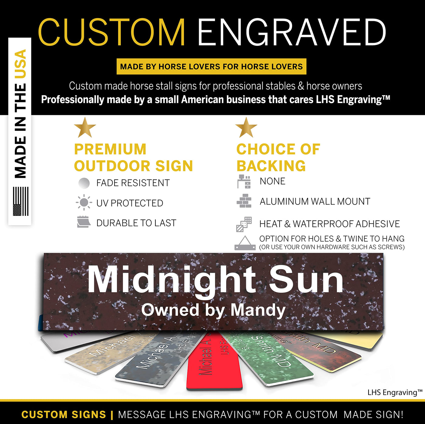 Barns, Stables And Trailers Are All Needed For Your Horse And Or Your Boarding Facility And A Horse Name Plate Is No Different. You Simply Just Need A Personalized Stall Plaque That Will Work And Looks Professional. Not Only For Yourself, Employees, But To Show Off Your Barn To Your Clients. But Also For These Animals We All Love.This Horse Stall Sign Is Made Specifically For Your Stable. You Could Use Office Name Plate Of Course. But Not All Are The Same. You Need A Ranch Sign Meant To Be Used Outside That Won'T Degrade Due To Temperature, Moisture, And Uv Rays And Will Hold Up Nice In Outdoors. A Properly Engraved Name Plate Is Important As You Need It To Be Engraved With The Pedigree, And/Or The Horses Name, (In Larger Characters) And The Horse Owner (In Smaller Characters). And Of Course You Need One That Looks Good So You Can Show It Off To All Your Neiiiiighbours (Sorry, Couldn'T Help It) These Work Great To Also Be Used With A Horse Trailer, Hang It Up At A Horse Show, Or Even To Customize A Utility Box. Either Way, This Is A Dedicated Indoor/Outdoor Horse Stall Name Plate That Will Look Just As Beautiful In Your Barn As Your Horse Does.