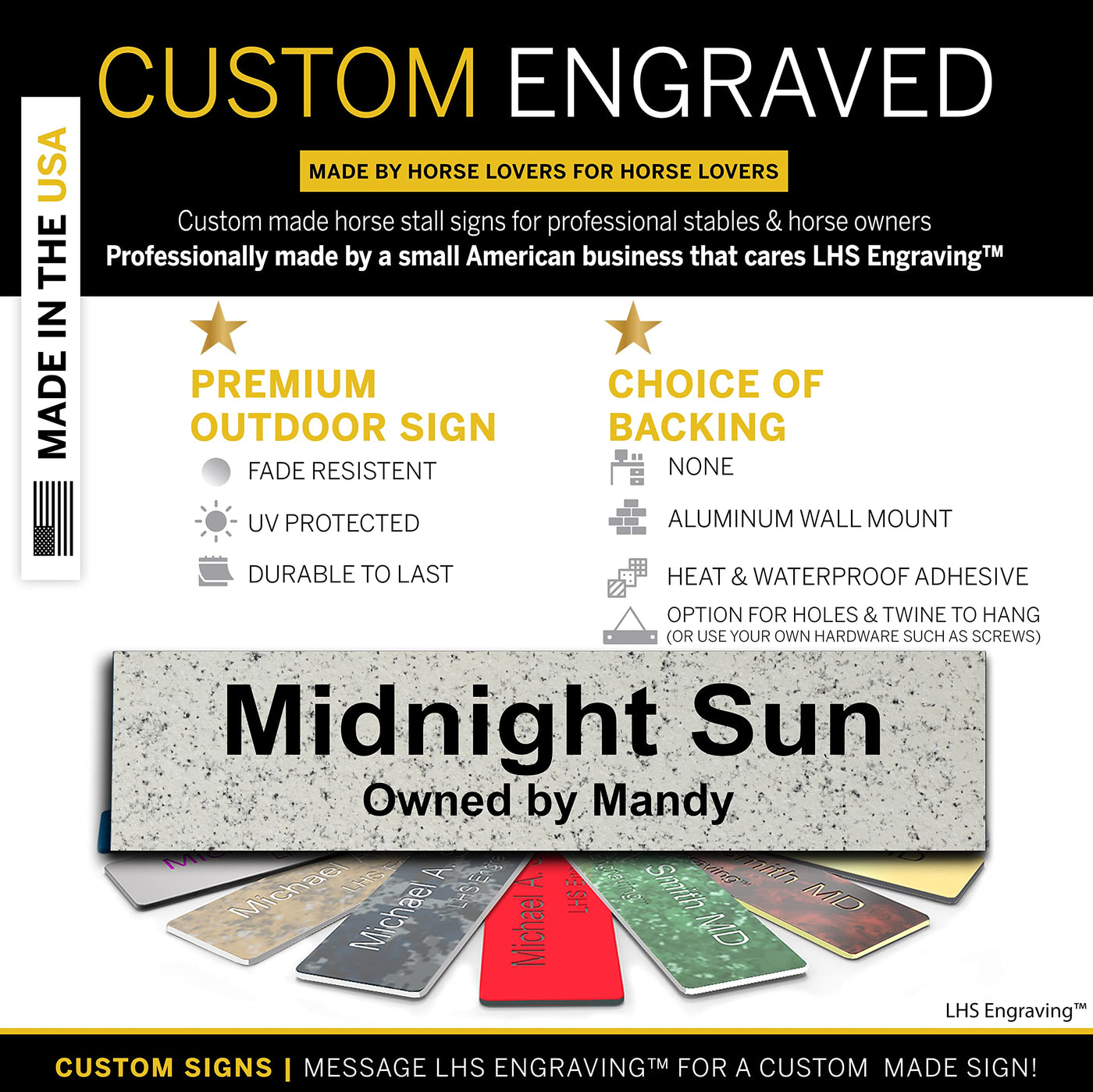 Barns, Stables And Trailers Are All Needed For Your Horse And Or Your Boarding Facility And A Horse Name Plate Is No Different. You Simply Just Need A Personalized Stall Plaque That Will Work And Looks Professional. Not Only For Yourself, Employees, But To Show Off Your Barn To Your Clients. But Also For These Animals We All Love.This Horse Stall Sign Is Made Specifically For Your Stable. You Could Use Office Name Plate Of Course. But Not All Are The Same. You Need A Ranch Sign Meant To Be Used Outside That Won'T Degrade Due To Temperature, Moisture, And Uv Rays And Will Hold Up Nice In Outdoors. A Properly Engraved Name Plate Is Important As You Need It To Be Engraved With The Pedigree, And/Or The Horses Name, (In Larger Characters) And The Horse Owner (In Smaller Characters). And Of Course You Need One That Looks Good So You Can Show It Off To All Your Neiiiiighbours (Sorry, Couldn'T Help It) These Work Great To Also Be Used With A Horse Trailer, Hang It Up At A Horse Show, Or Even To Customize A Utility Box. Either Way, This Is A Dedicated Indoor/Outdoor Horse Stall Name Plate That Will Look Just As Beautiful In Your Barn As Your Horse Does.