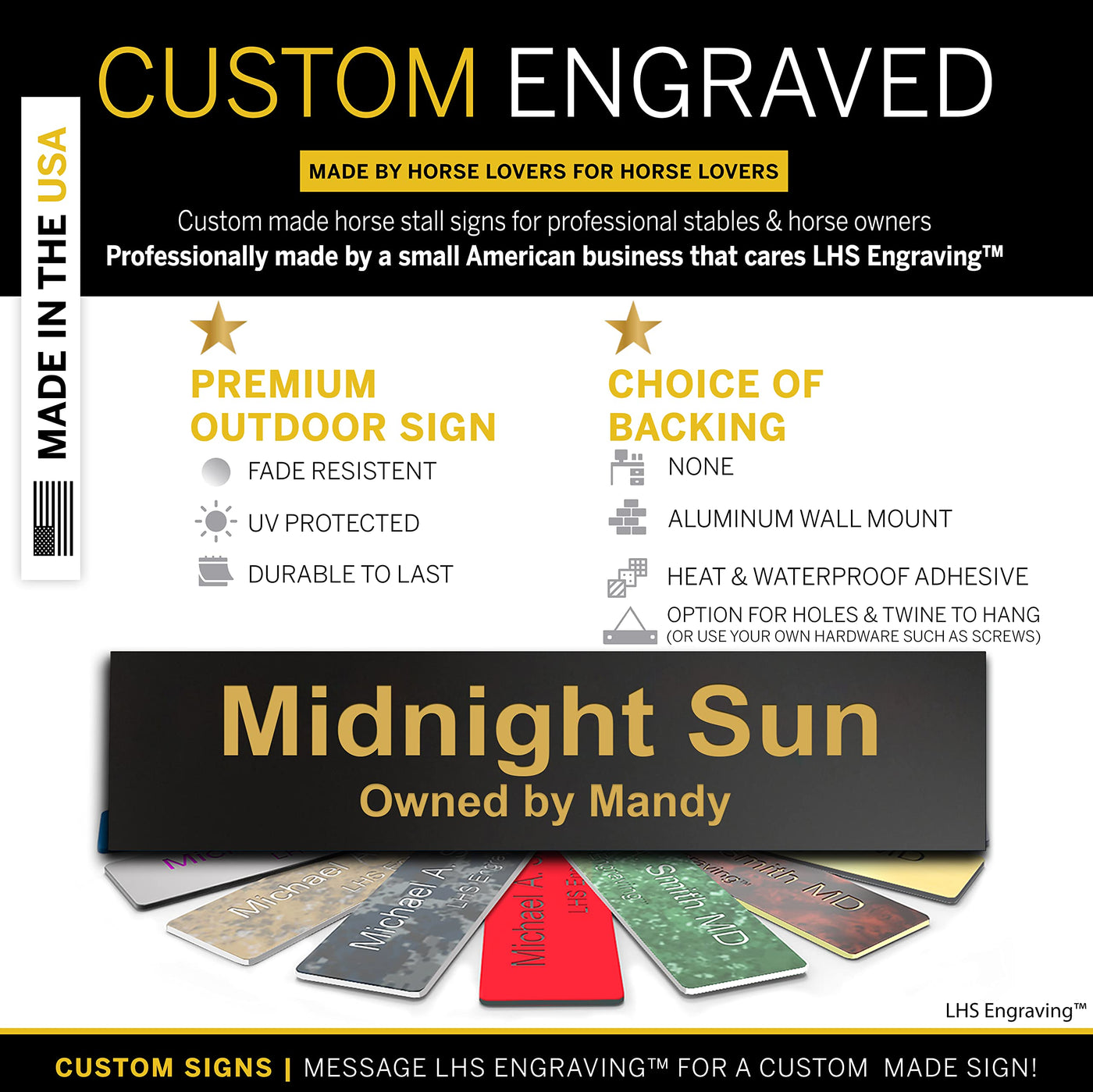 Lhs | Personalized Horse Stall Name Plates, 2X8 Horse Stall Signs With Adhesive, All Weather Uv Protected, Black Plastic Gold Le