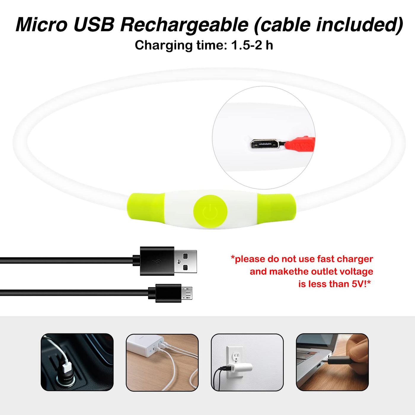 Q: How do I charge the Dlitk LED Dog Collar?A: The collar comes with a Micro USB charging cable and can be fully charged in about 2 hours. It is recommended to use only a 5V USB adapter for charging to avoid any potential damage.