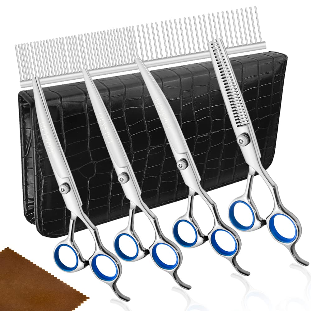 Q: What types of scissors are included in the LILYS PET Grooming scissors kit?A: The LILYS PET Grooming scissors kit includes four types of scissors: one straight scissors, one thinning scissors, one up-curved scissors, and one down-curved scissors, providing versatility for all grooming needs.