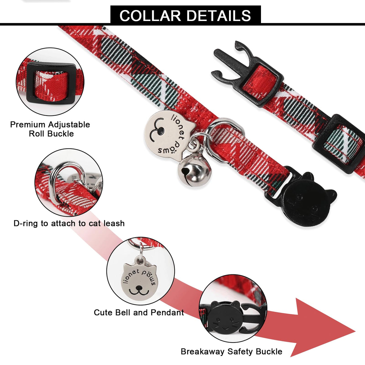 ?Safe Breakaway Cat Collar?The sturdy detachable safety release buckle can be unlocked with a certain amount of force.If your pet is trapped it can freely break free to avoid the pet being strangled by the collar ensure the safety of the pet.