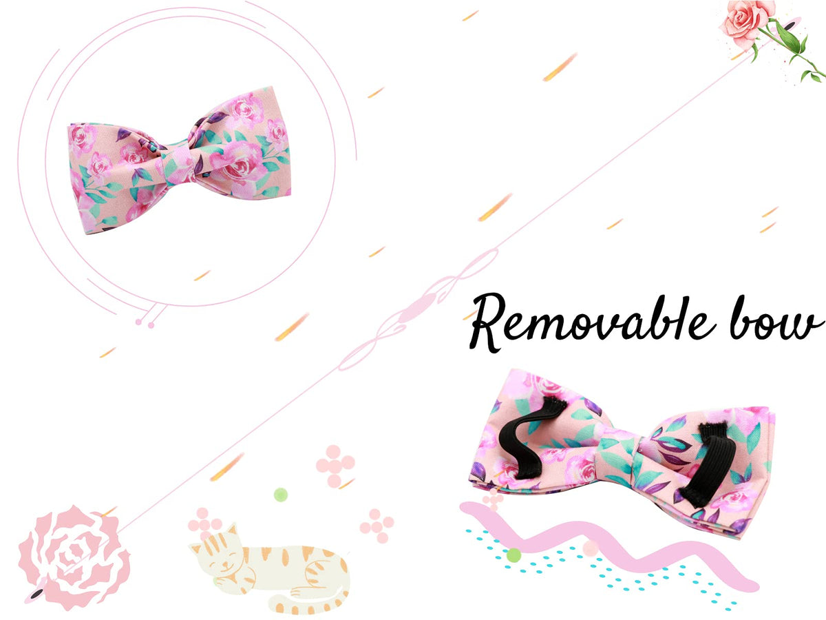 Q: Can the bowtie be removed or adjusted on the collar?A: Yes, the handmade bowtie is attached to the collar using two elastic straps, allowing for easy removal or adjustment. The elastic positioning prevents the bow from moving around, ensuring it stays securely in place.